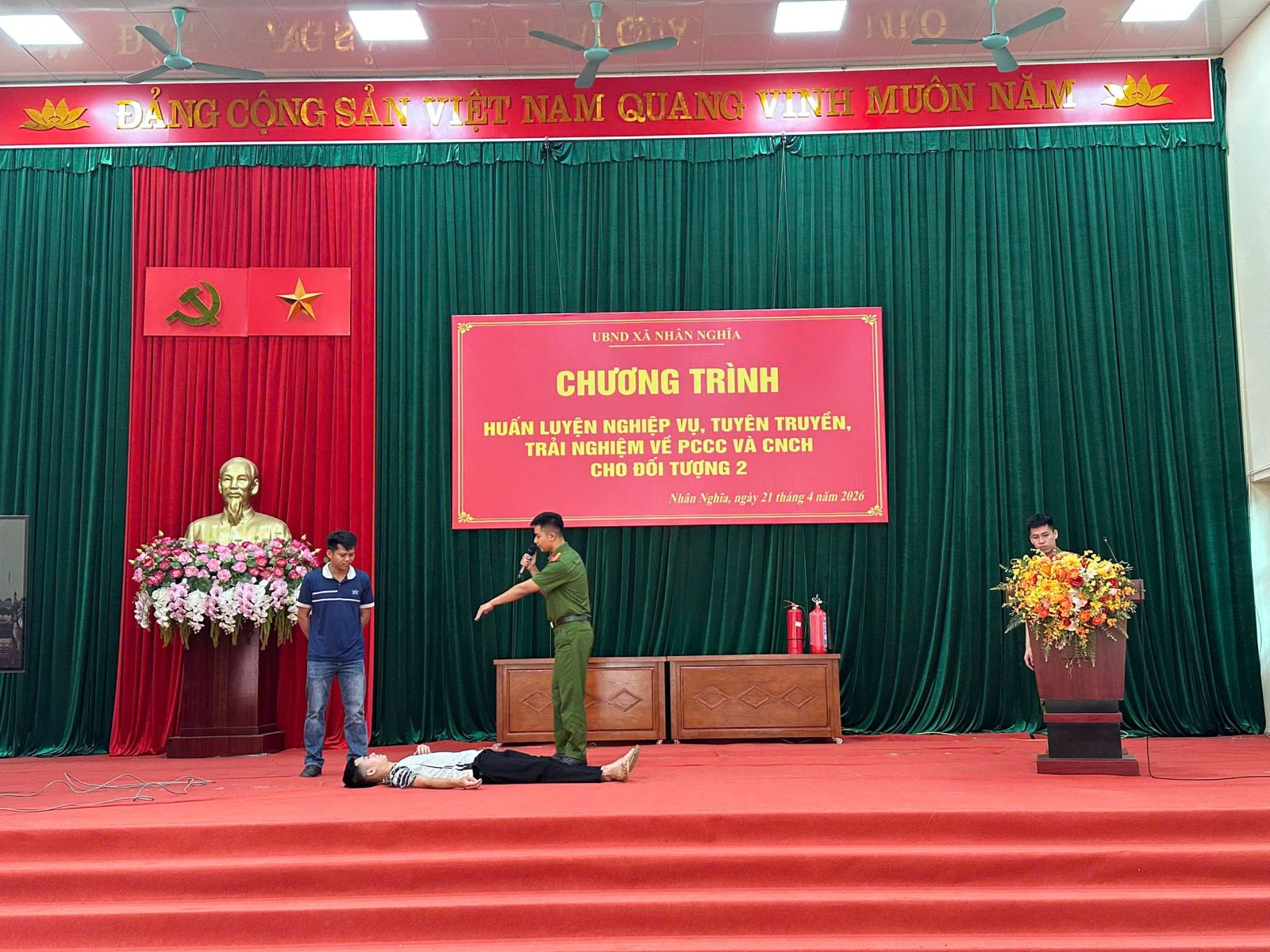 Ngày 21/4/2026, Công an xã Nhân Nghĩa đã tham mưu Ủy ban nhân dân xã phối hợp với các đơn vị chức năng tổ chức chương trình huấn luyện nghiệp vụ, tuyên truyền và trải nghiệm thực hành phòng cháy, chữa cháy và cứu nạn, cứu hộ (PCCC & CNCH) cho lực lượng đối tượng 2 trên địa bàn xã.