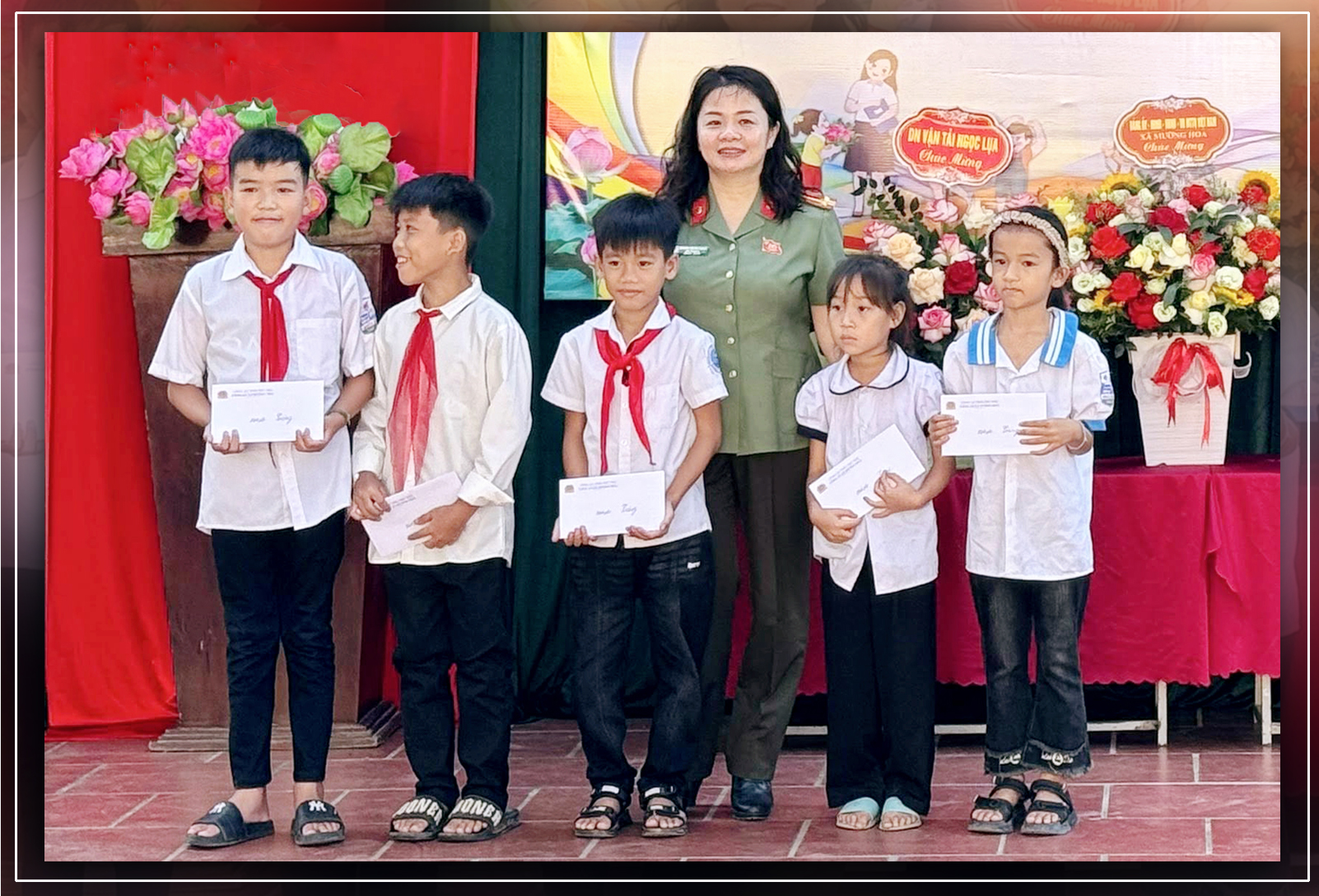 Ngày 05/9/2025, chương trình “Cùng em đến trường” do chị tham mưu, điều hành đã trao 30 phần quà đến các học sinh có hoàn cảnh khó khăn tại ba điểm mầm non và ba điểm tiểu học - THCS. Chị đứng cùng phụ huynh và học sinh, hướng dẫn thầy cô về góc học tập an toàn, lối thoát nạn, bình chữa cháy ở hành lang. Niềm vui của trẻ nhỏ, sự yên lòng của người lớn trở thành động lực để các hoạt động thiện nguyện của công an xã trở thành nếp thường xuyên.