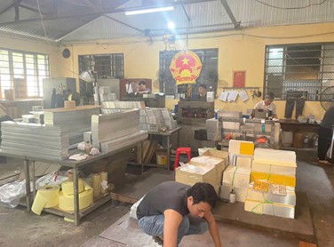 (Hình ảnh CBCS trả biển số sản xuất cho các đơn vị đặt biển) Tại xưởng sản xuất, các dây chuyền máy khắc, ép, dập hoạt động liên tục; nhiều công nhân, kỹ thuật viên làm việc cả ban đêm để kịp tiến độ, với mong muốn người dân sớm được nhận biển số, thuận tiện khi đi lại và làm thủ tục đăng ký xe. Mỗi công đoạn đều được kiểm tra kỹ lưỡng, từ ký tự, màu sơn đến lớp phản quang nhằm bảo đảm tính chính xác, thẩm mỹ và độ bền cao cho từng tấm biển số.