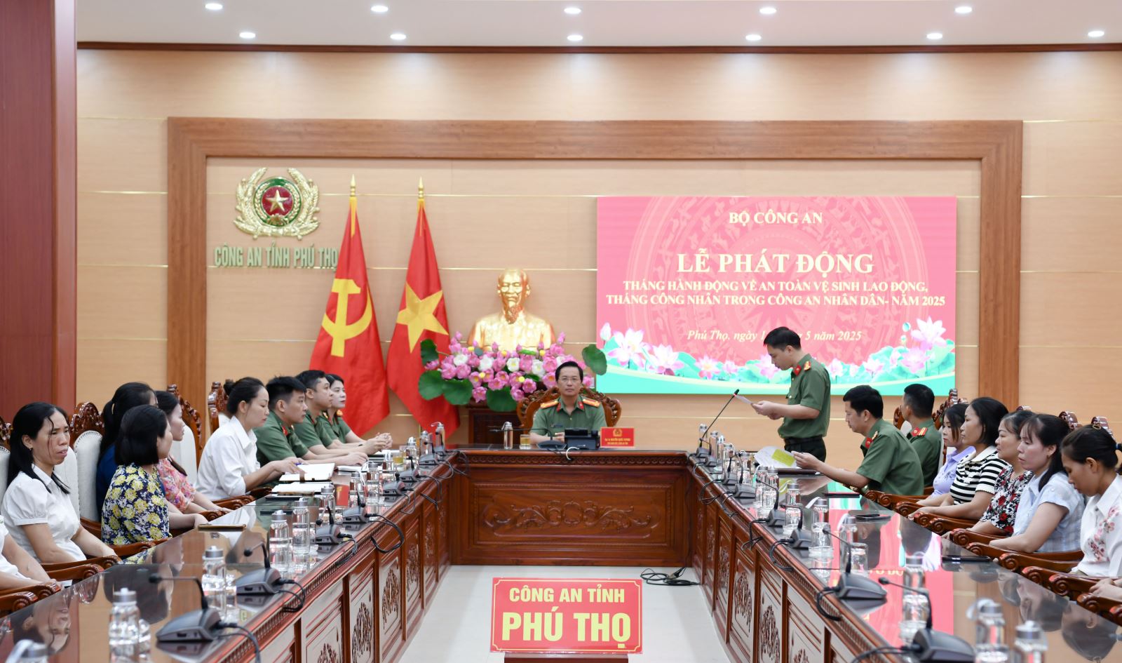 Sáng 14/5/2025, tại Hà Nội, Bộ Công an tổ chức Lễ phát động Tháng hành động về an toàn vệ sinh lao động (ATVSLĐ), Tháng công nhân trong CAND năm 2025. Thiếu tướng Đặng Hồng Đức, Thứ trưởng Bộ Công an dự và chỉ đạo buổi Lễ. Tại điểm cầu Công an tỉnh Phú Thọ, đồng chí Đại tá Nguyễn Quốc Vương, Phó Giám đốc Công an tỉnh chủ trì Lễ. Dự hội nghị có đại diện lãnh đạo các phòng Công an tỉnh; Ban Thanh niên, Ban Phụ nữ và 20 LĐHĐ tiêu biểu thuộc Công an tỉnh.