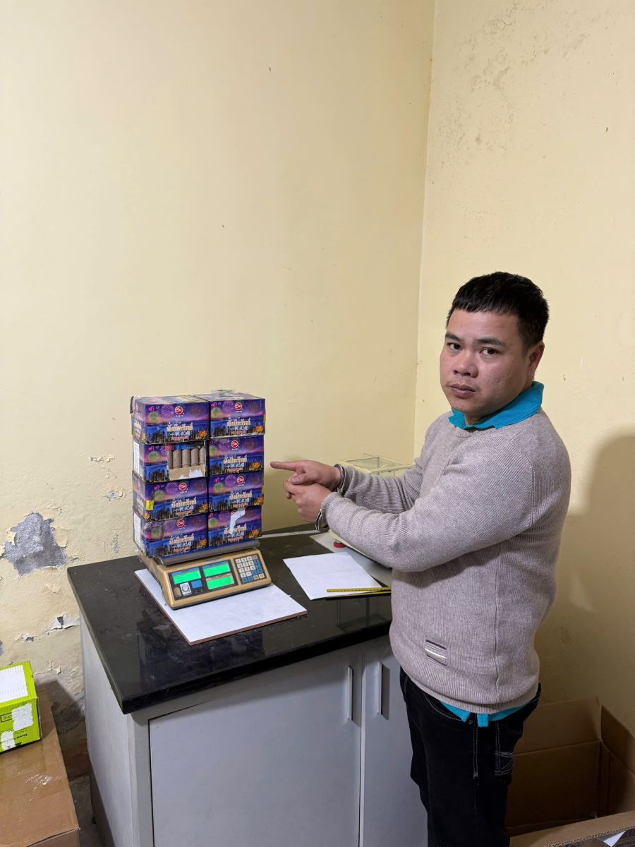 Tiến hành kiểm tra, lực lượng Công an phát hiện Nguyễn Thái Dương đang cầm 01 bao tải màu trắng. Kiểm tra bên trong bao tải, phát hiện 08 khối hộp hình chữ nhật, bên ngoài bọc giấy nhiều màu sắc, in ký tự nước ngoài và hình ảnh pháo hoa; mỗi khối có kích thước khoảng 16cm x 16cm x 10cm.