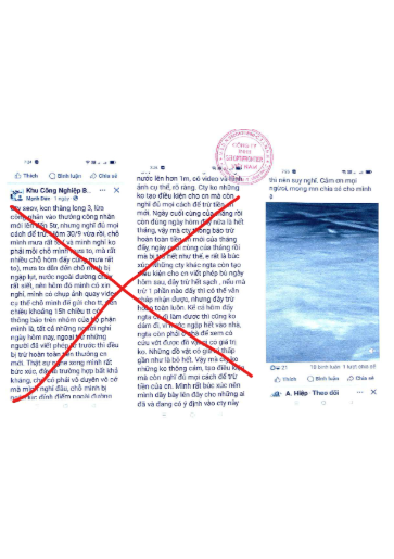 Kết quả cho thấy người đăng tải bài viết là chị Đ.H.N (sinh năm 1999), công nhân Công ty TNHH SEOV tại KCN Thăng Long Vĩnh Phúc. Chị Đ.H.N đã sử dụng tài khoản Facebook giả mạo “M. Đ.” để đăng nội dung trên. Làm việc với cơ quan Công an, chị Đ.H.N thừa nhận toàn bộ hành vi của mình, khai rằng do thiếu hiểu biết pháp luật và không kiểm chứng thông tin nên đã chia sẻ nội dung sai sự thật.