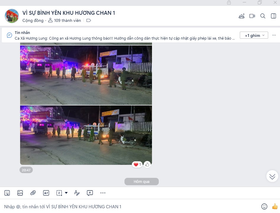 Thông qua nhóm Zalo “Vì bình yên khu dân cư”, các chủ trương của Đảng, chính sách, pháp luật của Nhà nước, thông báo của chính quyền địa phương và lực lượng Công an được truyền tải kịp thời đến từng hộ dân. Nội dung tuyên truyền phong phú, thiết thực như: phòng, chống tội phạm; phòng cháy, chữa cháy; an toàn giao thông; phòng chống ma túy; cảnh báo phương thức, thủ đoạn của tội phạm công nghệ cao; tuyên truyền về quản lý, sử dụng vũ khí, vật liệu nổ, pháo…
