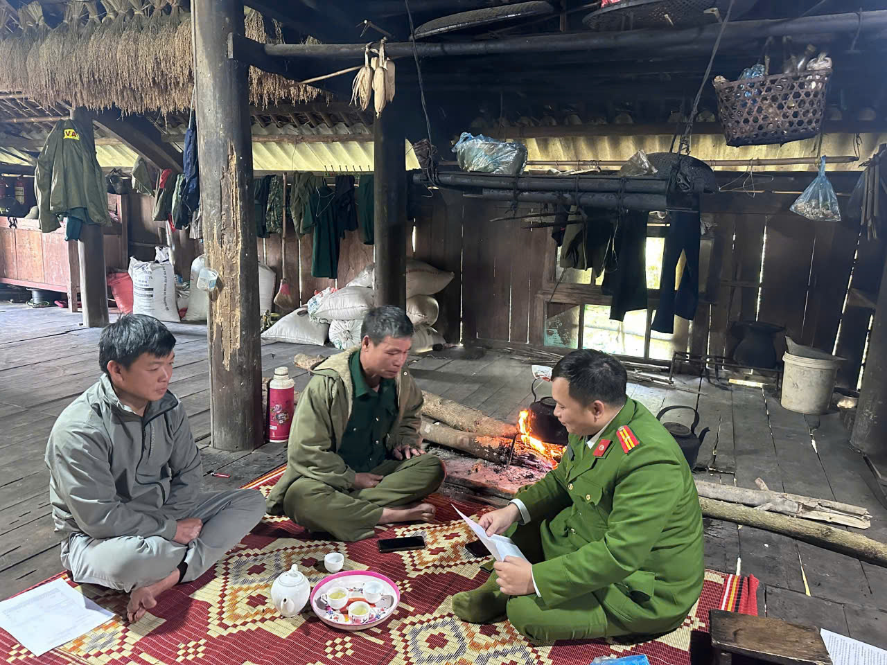 Công an xã Tân Sơn làm việc, phối hợp với già làng, trưởng bảnm người có uy tín tại địa bàn