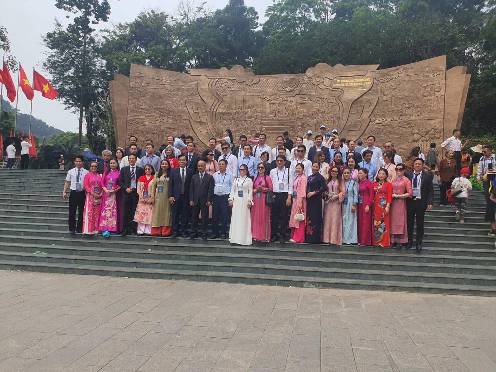 Đoàn Kiều bào chụp ảnh lưu niệm tại Bức phù điêu (Khu di tích lịch sử Đền Hùng)