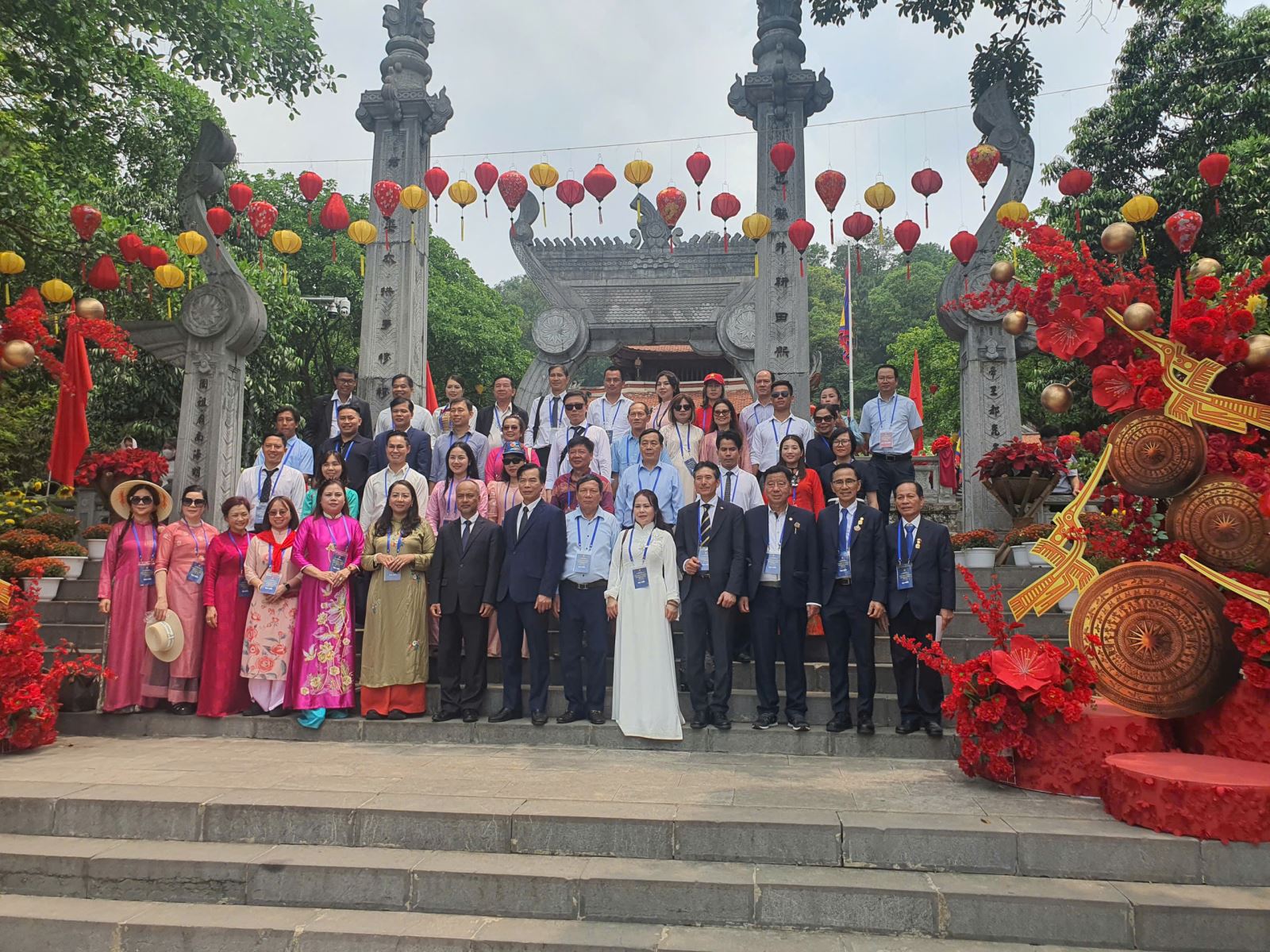 Đoàn Kiều bào chụp ảnh lưu niệm tại Đền quốc tổ Lạc Long Quân