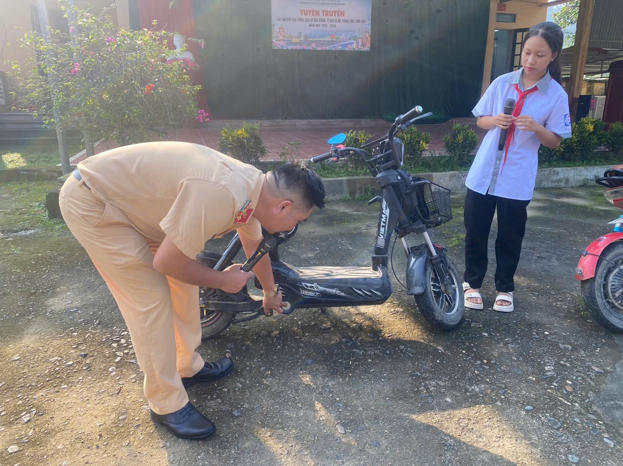 Tại buổi hoạt động ngoại khóa, các đồng chí cán bộ Công an xã An Bình và Phòng Cảnh sát Giao thông Công an tỉnh Phú Thọ đã trực tiếp phổ biến, hướng dẫn và trao đổi những kiến thức thiết thực về an toàn giao thông, tập trung vào các quy định mới của Luật Giao thông đường bộ và những hành vi thường gặp dễ dẫn đến vi phạm, thực hành phân biệt nhận biết xe máy điện và xe đạp điện - những quy định về độ tuổi được điều khiển phương tiện giao thông theo quy định của pháp luật.