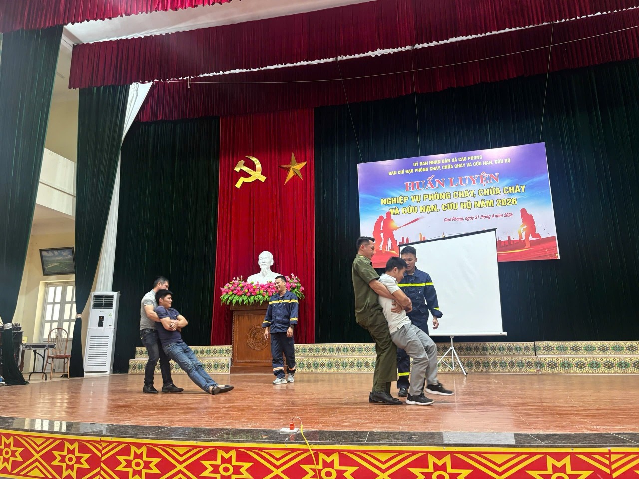 Tiếp đó, ngày 21/4, đơn vị đã phối hợp với UBND xã Cao Phong tổ chức lớp huấn luyện cho 330 người là trưởng khu dân cư, lực lượng dân phòng và lực lượng bảo vệ an ninh trật tự ở cơ sở. Đây là lực lượng nòng cốt, đóng vai trò quan trọng trong việc xử lý các tình huống cháy, nổ ngay từ thời điểm mới phát sinh theo phương châm "bốn tại chỗ".