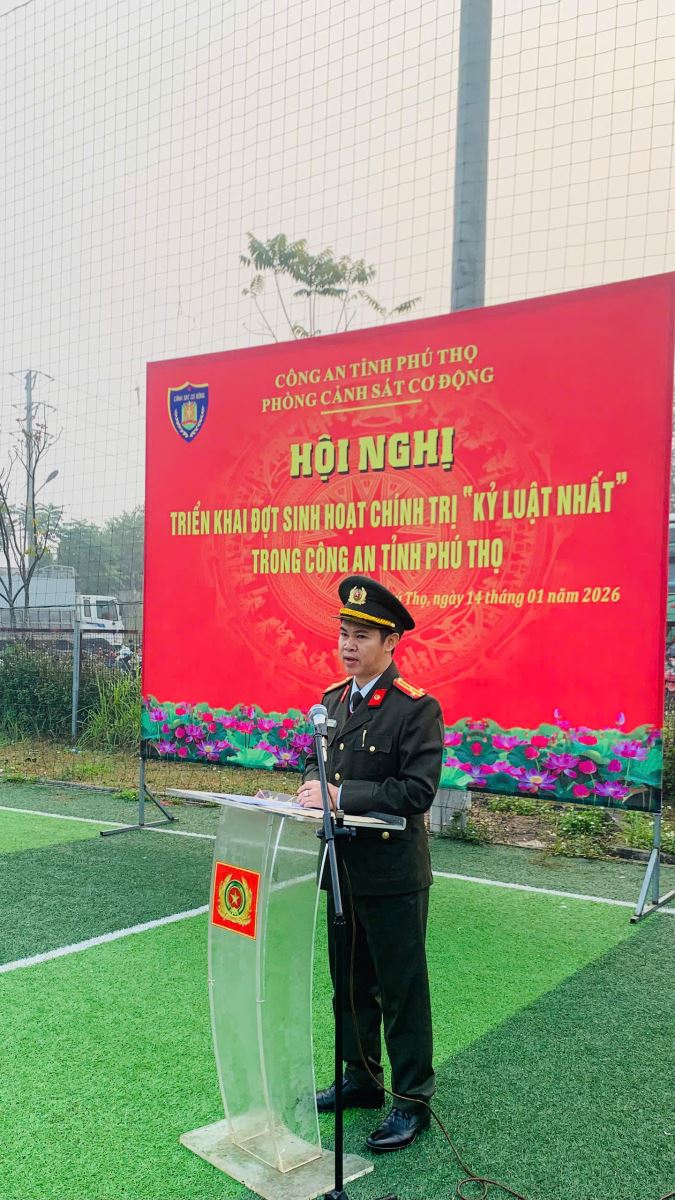 Thực hiện chủ trương của Đảng ủy, Ban Giám đốc Công an tỉnh Phú Thọ về tăng cường kỷ luật, kỷ cương, xây dựng lực lượng Công an nhân dân thật sự trong sạch, vững mạnh, sáng ngày 14/01/2026, Phòng Cảnh sát cơ động Công an tỉnh Phú Thọ đã tổ chức Hội nghị triển khai đợt sinh hoạt chính trị với chủ đề “Kỷ luật nhất”.