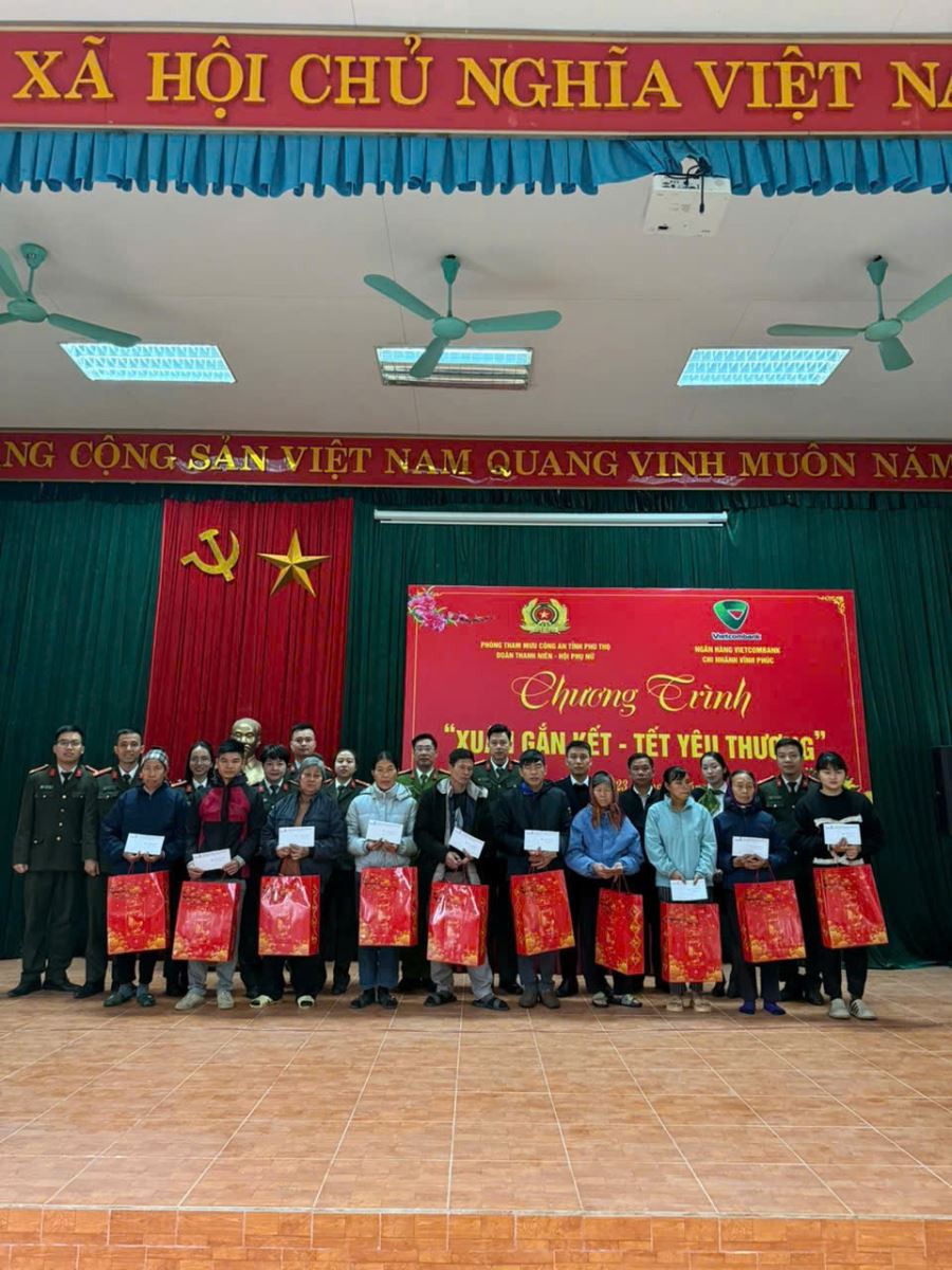 Hưởng ứng phong trào thi đua “Ba nhất: Kỷ luật nhất - Trung thành nhất - Gần dân nhất” trong Công an tỉnh; chiến dịch “Tình nguyện mùa đông 2025 - Xuân tình nguyện 2026” và thiết thực chào mừng thành công Đại hội Đại biểu toàn quốc lần thứ XIV của Đảng. Ngày 23/01/2026, Phòng Tham mưu Công an tỉnh Phú Thọ chủ trì, phối hợp Ngân hàng TMCP Việt Nam chi nhánh Vĩnh Phúc tổ chức chương trình “Xuân gắn kết - Tết yêu thương” tại xã Đạo Trù, tỉnh Phú Thọ.