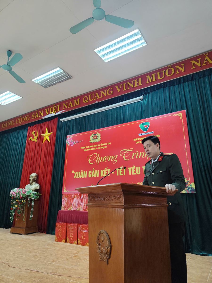 Phát biểu tại chương trình, đồng chí Trung tá Đỗ Mạnh Tùng nhấn mạnh chương trình “Xuân gắn kết - Tết yêu thương” là một trong những nội dung cụ thể nhằm triển khai phong trào thi đua “Gần dân nhất”, đồng thời phát huy vai trò xung kích, tình nguyện của đoàn viên, hội viên trong tham gia các hoạt động an sinh xã hội, hướng về cơ sở, phục vụ Nhân dân.