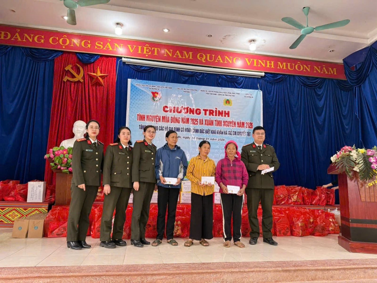 Hưởng ứng phong trào “Tình nguyện mùa đông 2025 – Xuân tình nguyện 2026” và chào mừng Đại hội đại biểu toàn quốc lần thứ XIV của Đảng, ngày 18/01/2026, Đoàn Thanh niên – Hội Phụ nữ Phòng Tổ chức cán bộ Công an tỉnh Phú Thọ phối hợp với Đoàn Thanh niên, Hội Phụ nữ một số đơn vị trong khối xây dựng lực lượng, tham mưu, hậu cần và khối Cảnh sát tổ chức các hoạt động tình nguyện, an sinh xã hội tại xã Mường Bi, tỉnh Phú Thọ.
