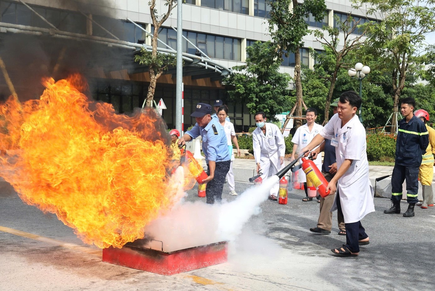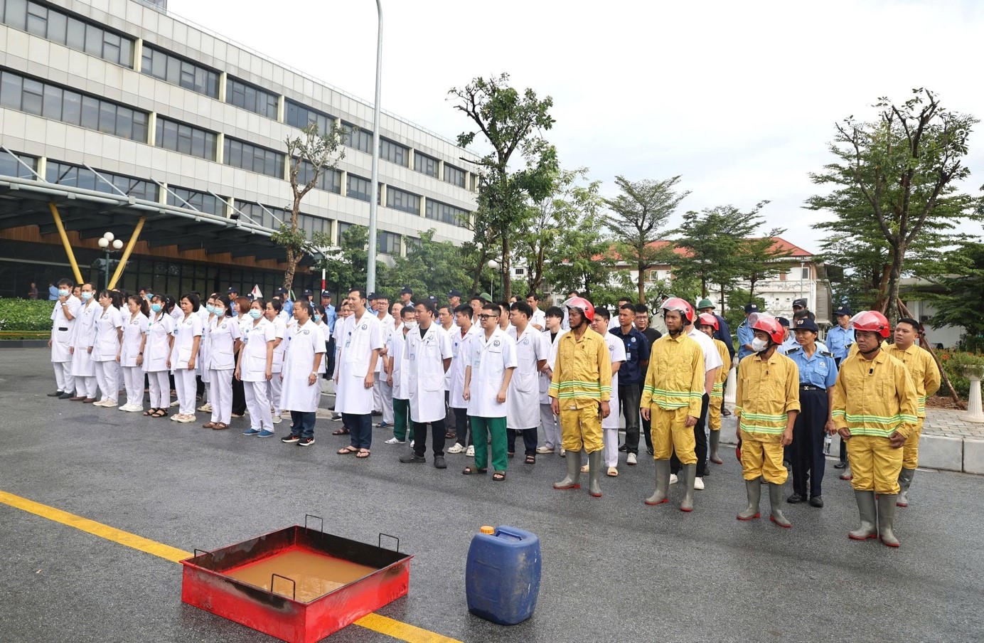 Các lực lượng tham gia buổi tuyên truyền, diễn tập Cùng với công tác tuyên truyền, đơn vị đã tổ chức buổi thực tập Phương án chữa cháy và cứu nạn, cứu hộ theo tình huống giả định: Xảy ra cháy lớn tại tầng 5 của bệnh viện do sự cố chập điện; ngọn lửa nhanh chóng lan sang khu vực làm việc, phòng khám có nhiều bệnh nhân và cán bộ, nhân viên bị mắc kẹt. Lực lượng PCCC cơ sở triển khai đội hình chữa cháy ban đầu, tổ chức di chuyển người và tài sản, đồng thời báo cho lực lượng chuyên nghiệp đến hỗ trợ, khống chế đám cháy và cứu người bị nạn. Tại buổi huấn luyện, cán bộ, nhân viên bệnh viện được trực tiếp tham gia các đội hình chữa cháy, rèn luyện kỹ năng xử lý tình huống thực tế, qua đó nâng cao nhận thức, ý thức trách nhiệm và khả năng phối hợp trong công tác phòng ngừa, ứng phó khi xảy ra sự cố cháy, nổ.