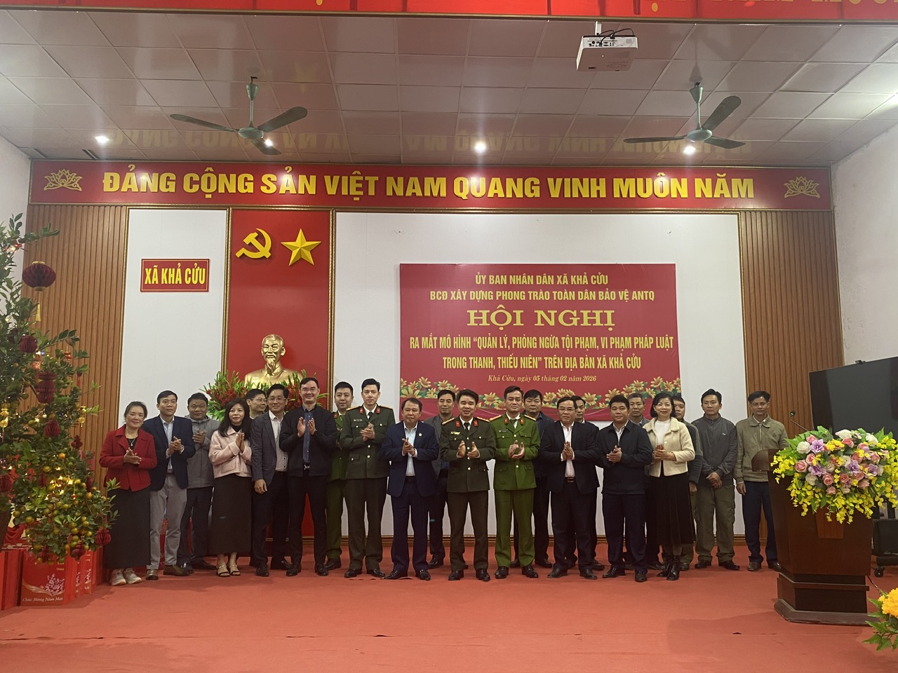 Sáng ngày 05/02/2026, Ban Chỉ đạo Xây dựng phong trào toàn dân bảo vệ an ninh Tổ quốc xã Khả Cửu tổ chức Lễ ra mắt mô hình “Quản lý, phòng ngừa tội phạm, vi phạm pháp luật trong thanh, thiếu niên” trên địa bàn xã. Dự và phát biểu chỉ đạo tại Hội nghị có đồng chí Đại tá Nguyễn Văn Công, Phó Giám đốc Công an tỉnh, Phó Trưởng Ban Thường trực Ban Chỉ đạo Xây dựng phong trào toàn dân bảo vệ an ninh Tổ quốc tỉnh Phú Thọ.