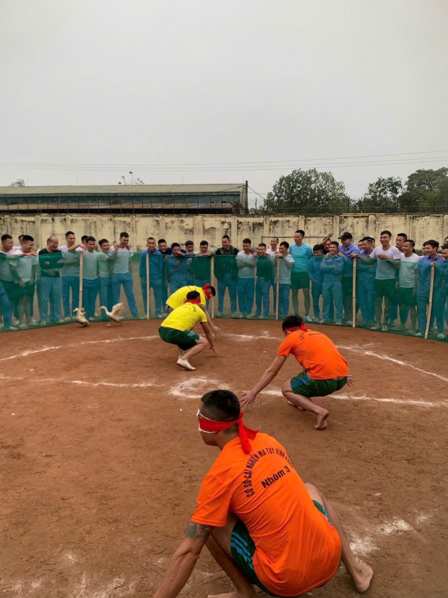 Bên cạnh đó, môn cờ tướng tạo sân chơi trí tuệ lành mạnh, giúp học viên rèn luyện tư duy logic, khả năng tập trung và tính kiên nhẫn. Các trò chơi dân gian như bịt mắt bắt vịt, kéo co mang lại không khí vui vẻ, tiếng cười đầu Xuân, góp phần tăng cường sự gắn kết giữa học viên với nhau cũng như giữa học viên với cán bộ quản lý. Những hoạt động này không chỉ giúp giải trí mà còn hỗ trợ tích cực cho quá trình ổn định tâm lý, hình thành thói quen sinh hoạt lành mạnh trong môi trường tập thể.