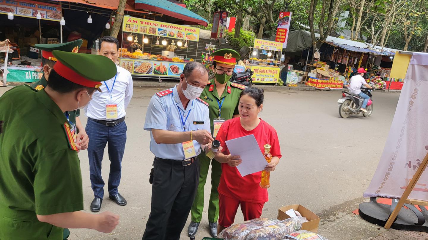 Đồng thời phối hợp Đoàn kiểm tra liên ngành tiến hành kiểm tra, kết hợp tuyên truyền, vận động nhân dân, du khách chấp hành chính sách pháp luật, nội quy, quy chế lễ hội, đồng thời kiểm tra, phát hiện, xử lý nghiêm các hành vi vi phạm. Tuyên truyền các hộ kinh doanh dịch vụ phục vụ lễ hội Đền Hùng cam kết thực hiện kinh doanh đúng pháp luật và niêm yết công khai giá bán các loại hàng hóa, giá các dịch vụ. Đồng thời tăng cường giám sát, kiểm tra, hướng dẫn các tổ chức, cá nhân nghiêm túc chấp hành các quy định về vệ sinh an toàn thực phẩm, không để xảy ra tình trạng hàng giả, hàng kém chất lượng, hàng bán không đúng giá niêm yết và các loại trò chơi mang tính cờ bạc, kinh doanh đồ chơi mang tính bạo lực trong Khu di tích.