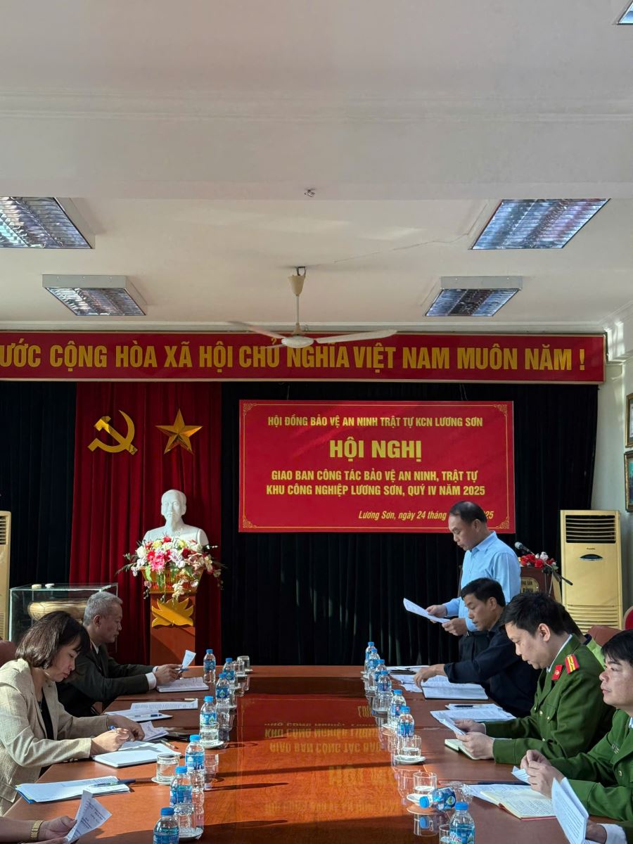 Ngày 24/12/2025, Hội đồng bảo vệ an ninh, trật tự Khu công nghiệp Lương Sơn tổ chức Hội nghị giao ban công tác bảo đảm an ninh, trật tự quý IV năm 2025. Hội nghị nhằm đánh giá tình hình, kết quả phối hợp bảo đảm an ninh, trật tự trong khu công nghiệp thời gian qua và triển khai một số nhiệm vụ trọng tâm trong thời gian tới.
