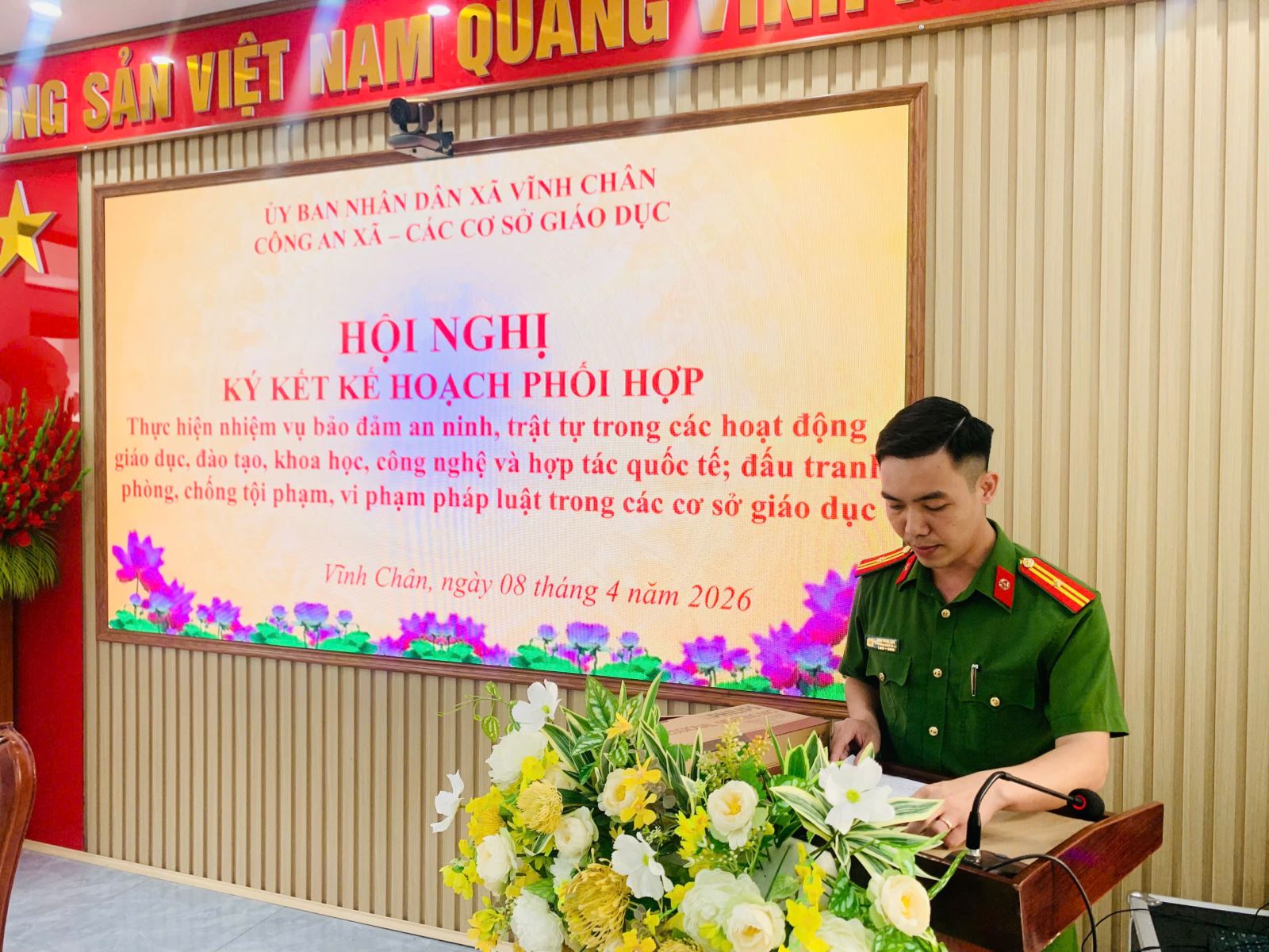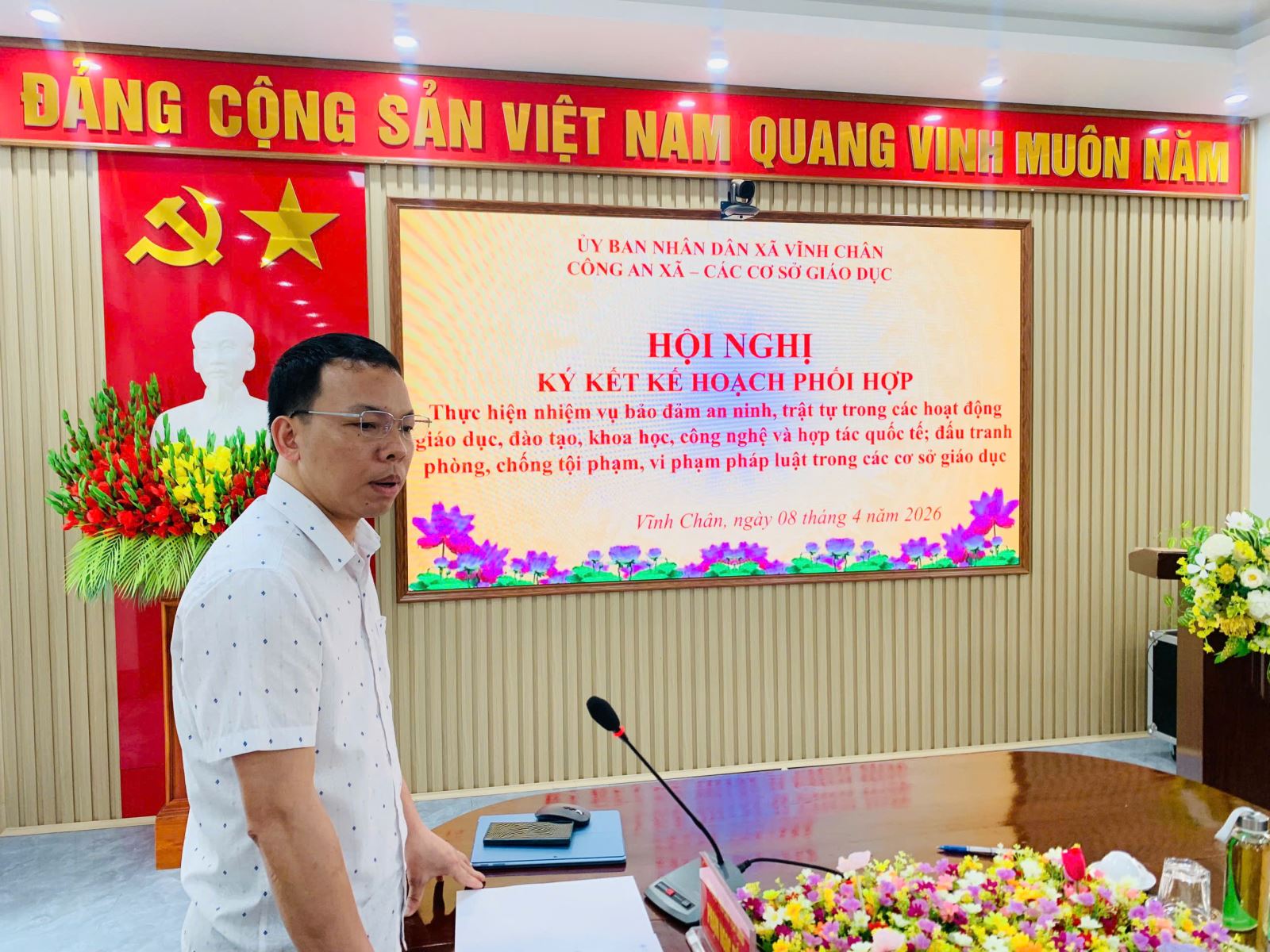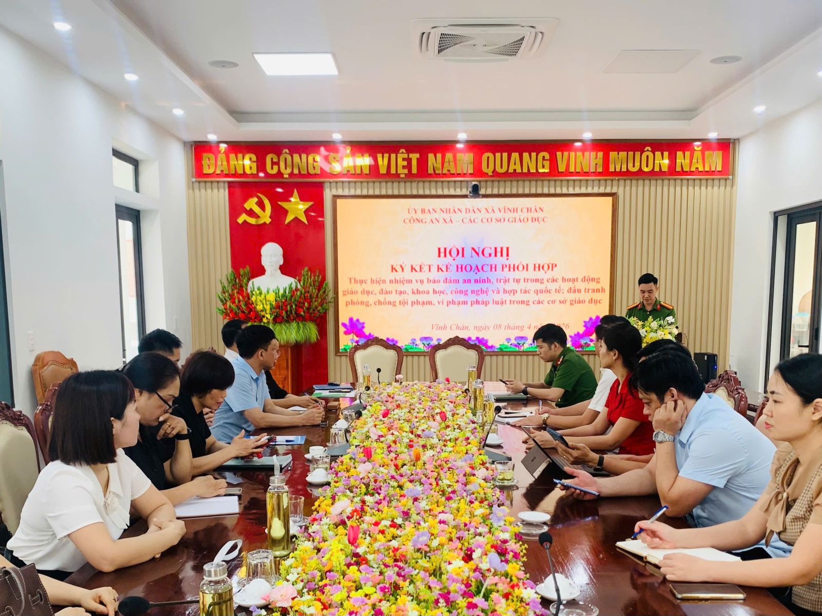 Nhằm nâng cao hiệu quả công tác bảo đảm an ninh, trật tự (ANTT) trong lĩnh vực giáo dục, ngày 08/4/2026, Công an xã Vĩnh Chân đã tham mưu UBND xã tổ chức Hội nghị ký kết kế hoạch phối hợp giữa lực lượng Công an xã và các cơ sở giáo dục trên địa bàn. Hoạt động này nhằm chủ động phòng ngừa, phát hiện và xử lý kịp thời các hành vi vi phạm pháp luật, xây dựng môi trường học đường an toàn, lành mạnh.
