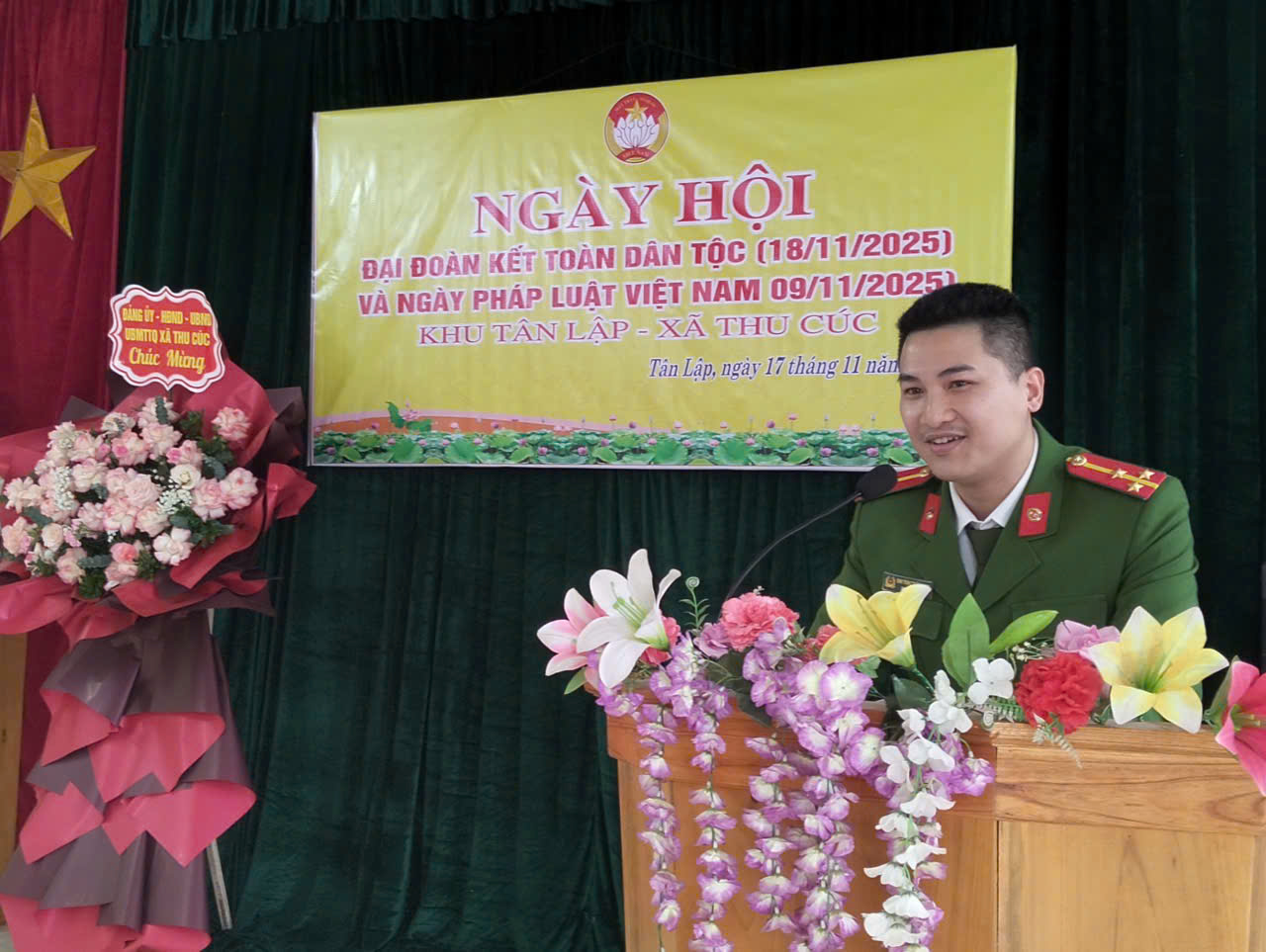 Ngày 17/11/2025, Công an xã Thu Cúc phối hợp với Ban Công tác Mặt trận các khu dân cư tổ chức tuyên truyền pháp luật cho Nhân dân ở toàn bộ 17 khu của xã. Tham dự Ngày hội có đại diện lãnh đạo các ban, ngành, đoàn thể của UBND xã, cán bộ Công an xã, người có uy tín trong cộng đồng và đông đảo Nhân dân.