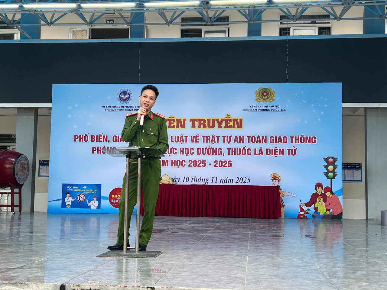 Thực hiện kế hoạch bảo đảm an ninh trật tự và xây dựng môi trường giáo dục an toàn, lành mạnh trong năm học 2025–2026, lực lượng Công an phường đã phối hợp với Trường THCS Hùng Vương tổ chức buổi tuyên truyền pháp luật với các nội dung trọng tâm: trật tự an toàn giao thông, phòng chống bạo lực học đường và tác hại của thuốc lá điện tử.