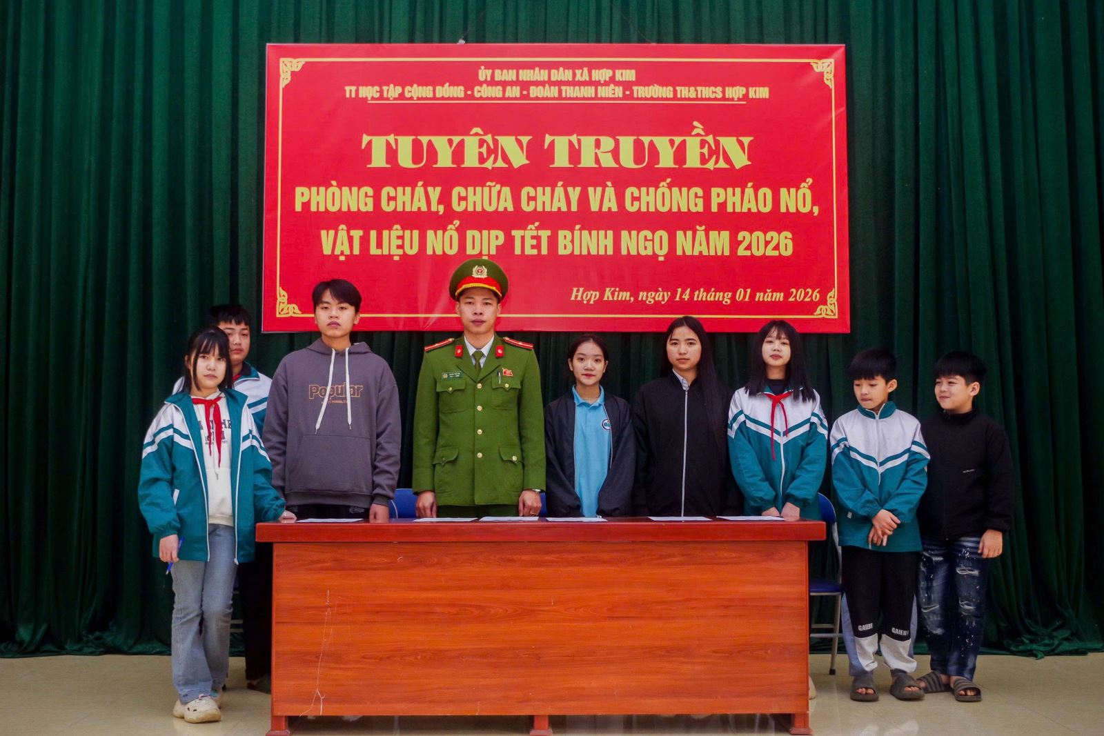 Nhằm nâng cao nhận thức, ý thức chấp hành pháp luật cho cán bộ, giáo viên và học sinh trong dịp Tết Nguyên đán, trong các ngày 12 và 14/01/2026, Công an xã Hợp Kim đã phối hợp với Trung tâm học tập cộng đồng xã và Đoàn Thanh niên xã Hợp Kim tổ chức tuyên truyền pháp luật về phòng cháy, chữa cháy; phòng, chống pháo nổ và vật liệu nổ tại điểm trường Tiểu học và Trung học cơ sở Sào Báy và điểm trường Tiểu học và Trung học cơ sở Hợp Kim.