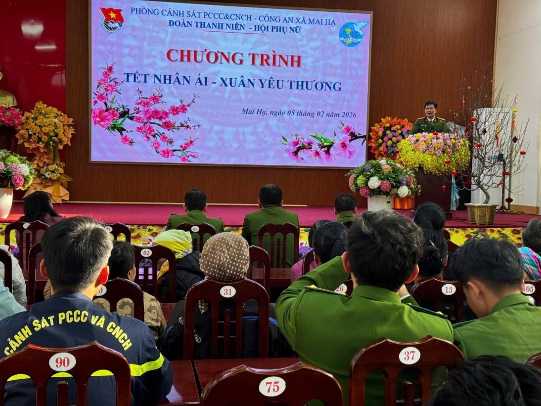 Chiều ngày 05/02/2026, tại Nhà văn hóa xã Mai Hạ, Chi đoàn Thanh niên – Chi hội Phụ nữ Công an xã Mai Hạ phối hợp với Đoàn Thanh niên – Hội Phụ nữ Phòng Cảnh sát PCCC và CNCH Công an tỉnh Phú Thọ tổ chức Chương trình “Tết nhân ái – Xuân yêu thương”. Hoạt động nhằm góp phần hỗ trợ các hộ gia đình có hoàn cảnh khó khăn trên địa bàn xã, đồng thời tăng cường gắn kết giữa lực lượng Công an với Nhân dân.