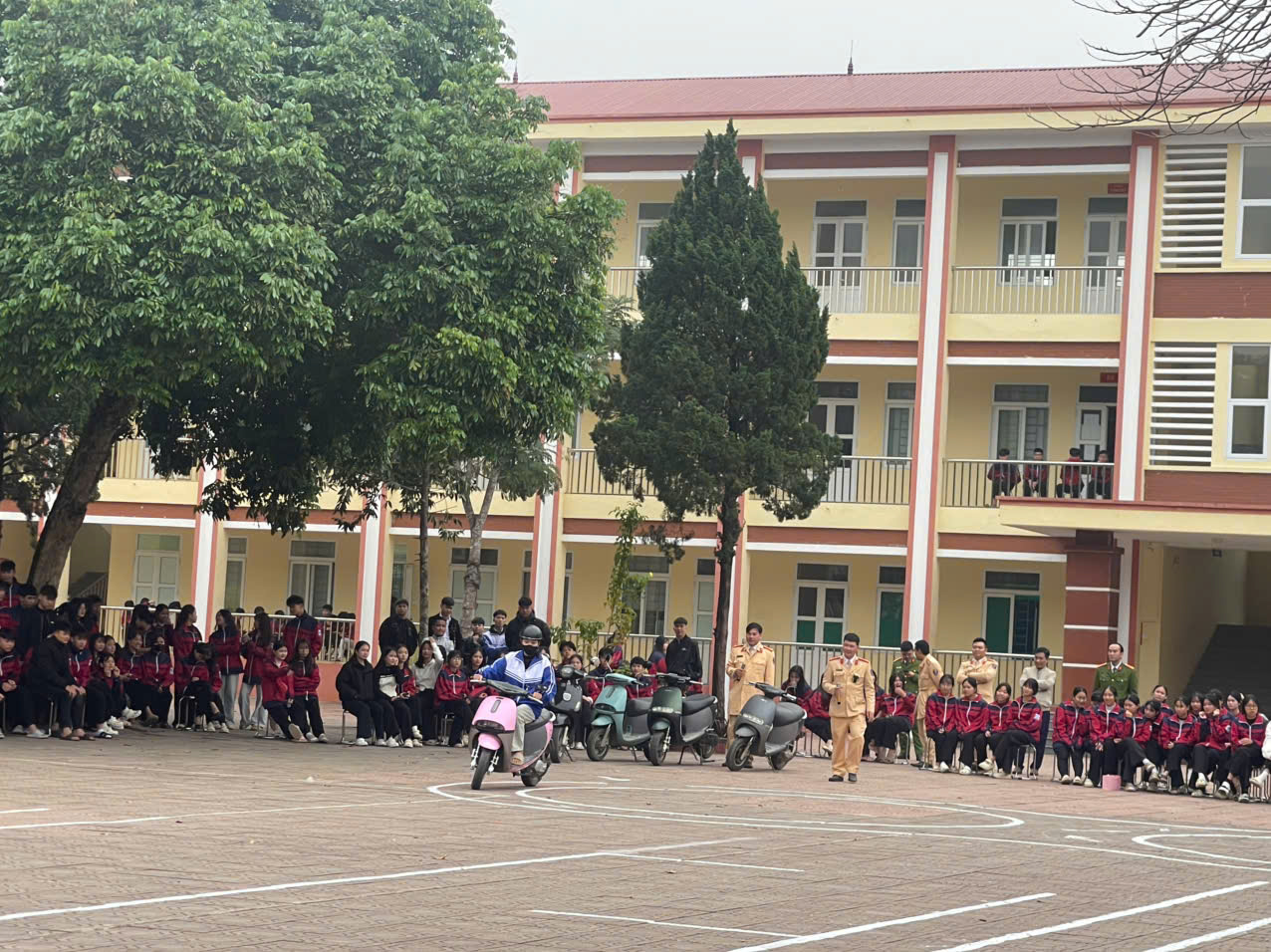 Hình ảnh buổi tập huấn Tại buổi tập huấn, cán bộ Công an đã phổ biến những nội dung cơ bản của Luật Trật tự an toàn giao thông đường bộ, tập trung vào các hành vi vi phạm thường gặp ở học sinh như không đội mũ bảo hiểm, chở quá số người quy định, đi không đúng phần đường, làn đường. Bên cạnh việc truyền đạt kiến thức lý thuyết, lực lượng chức năng đã đưa ra các tình huống thực tế thường xảy ra trên các tuyến đường liên xã, khu vực gần trường học để học sinh trao đổi, thảo luận và rút ra cách xử lý phù hợp.