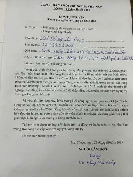 Ngày 22/9/2025, tại trụ sở Công an xã Lập Thạch, tỉnh Phú Thọ, anh Vũ Đặng Hải Đăng, sinh năm 2002, trú tại thôn Hồng Thái đã viết đơn tình nguyện tham gia thực hiện nghĩa vụ Công an nhân dân năm 2026. Đây là hành động thể hiện rõ tinh thần xung kích, trách nhiệm của tuổi trẻ và cá nhân anh Đăng trong sự nghiệp bảo vệ an ninh Tổ quốc.