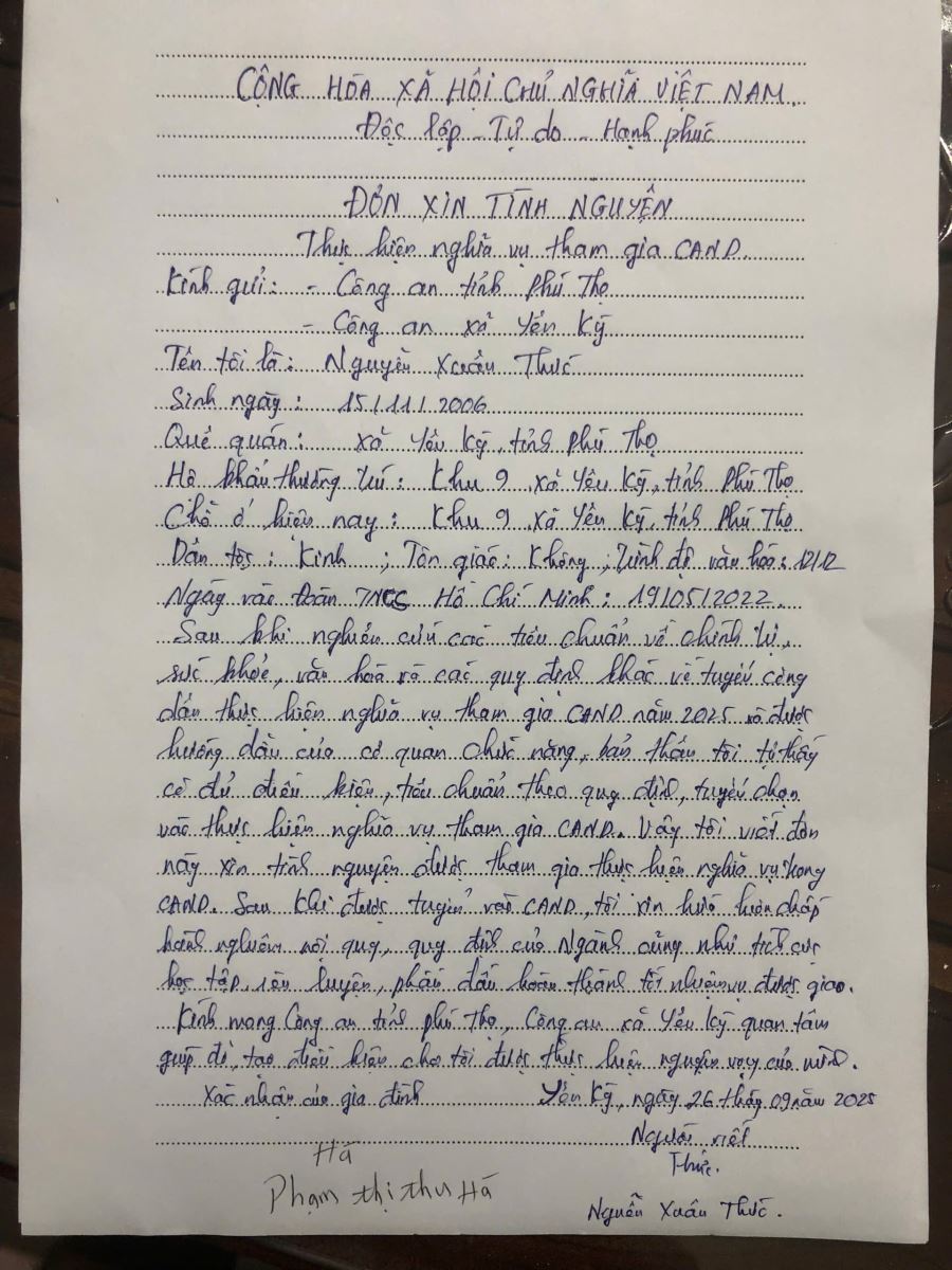 Thanh niên tình nguyện viết đơn thực hiện nghĩa vụ tham gia công an nhân dân – vinh dự và trách nhiệm (03/10/2025)
