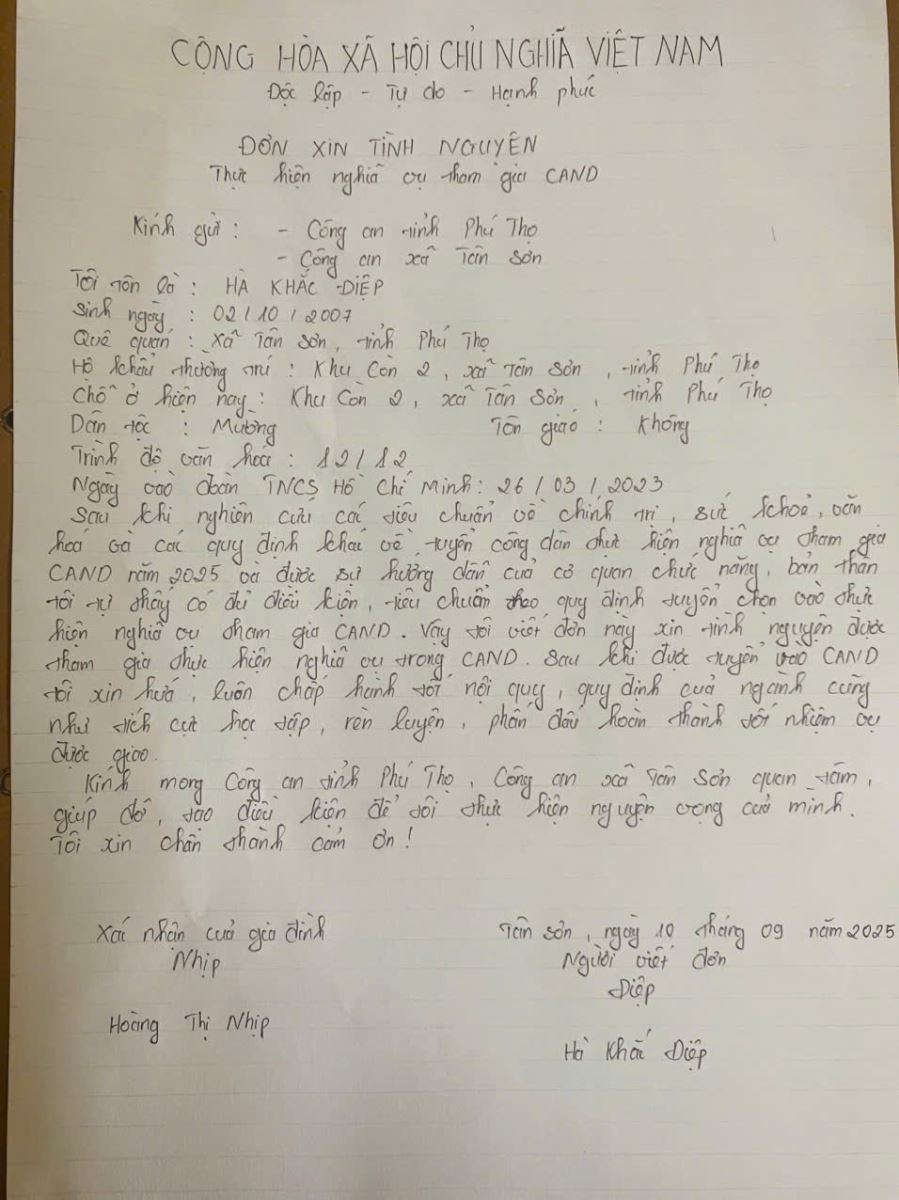 Trước mùa tuyển quân năm 2025, nam thanh niên Hà Khắc Điệp ở xã Tân Sơn đã viết đơn tình nguyện tham gia nghĩa vụ Công an nhân dân. Hành động này thể hiện tinh thần xung kích của tuổi trẻ, tiếp nối truyền thống tốt đẹp của thanh niên Việt Nam trong sự nghiệp xây dựng và bảo vệ Tổ quốc.