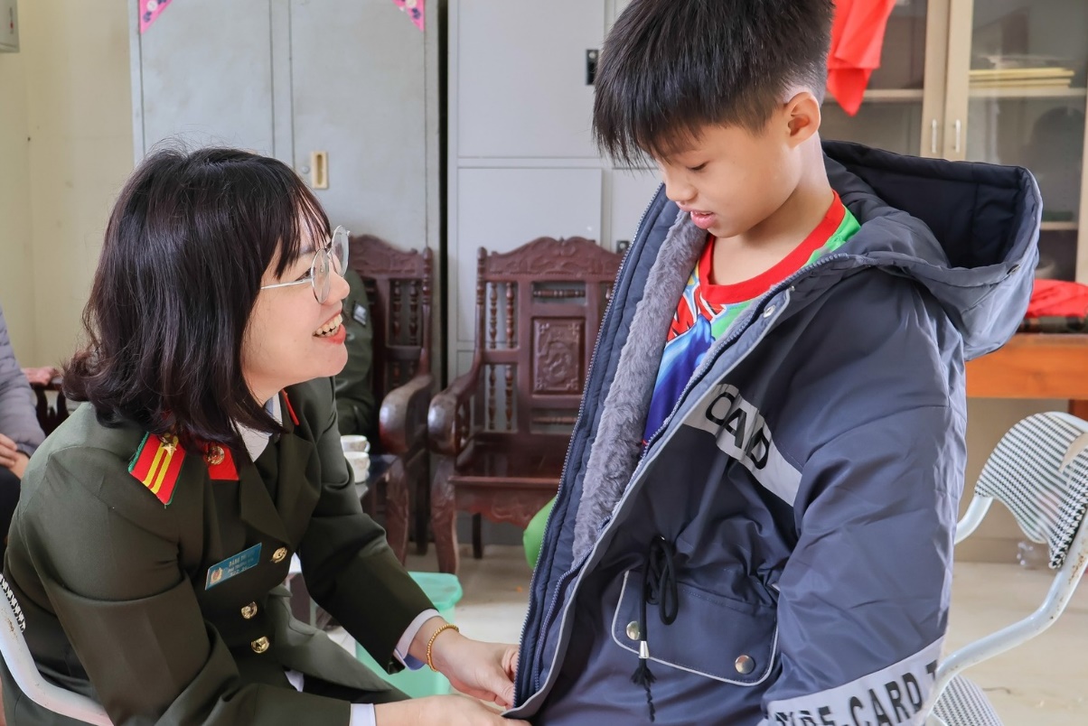 Thiếu tá Đặng Thị Hoa trong vai trò “Mẹ đỡ đầu” ân cần thăm hỏi, trao tặng áo ấm cho em nhỏ có hoàn cảnh khó khăn, tiếp thêm động lực để các em vươn lên trong học tập và cuộc sống