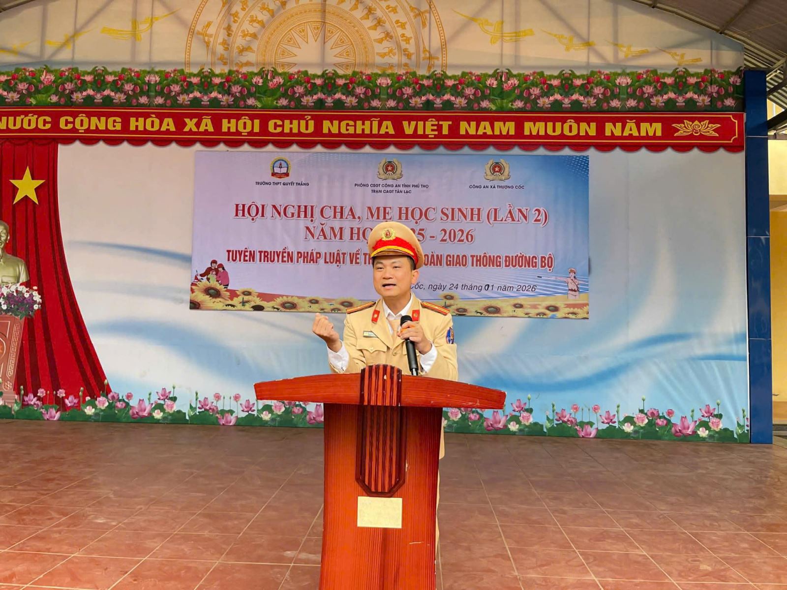 Trong công tác tuyên truyền pháp luật, ngày 24/01/2026, Công an xã Thượng Cốc phối hợp Phòng Cảnh sát giao thông Công an tỉnh Phú Thọ tổ chức tuyên truyền pháp luật về trật tự, an toàn giao thông đường bộ cho khoảng 250 học sinh Trường THPT Quyết Thắng. Nội dung tuyên truyền tập trung vào các quy định cơ bản của pháp luật giao thông, độ tuổi điều khiển phương tiện, đội mũ bảo hiểm và những hành vi vi phạm thường gặp trong lứa tuổi học sinh, góp phần nâng cao ý thức chấp hành pháp luật, phòng ngừa tai nạn giao thông.