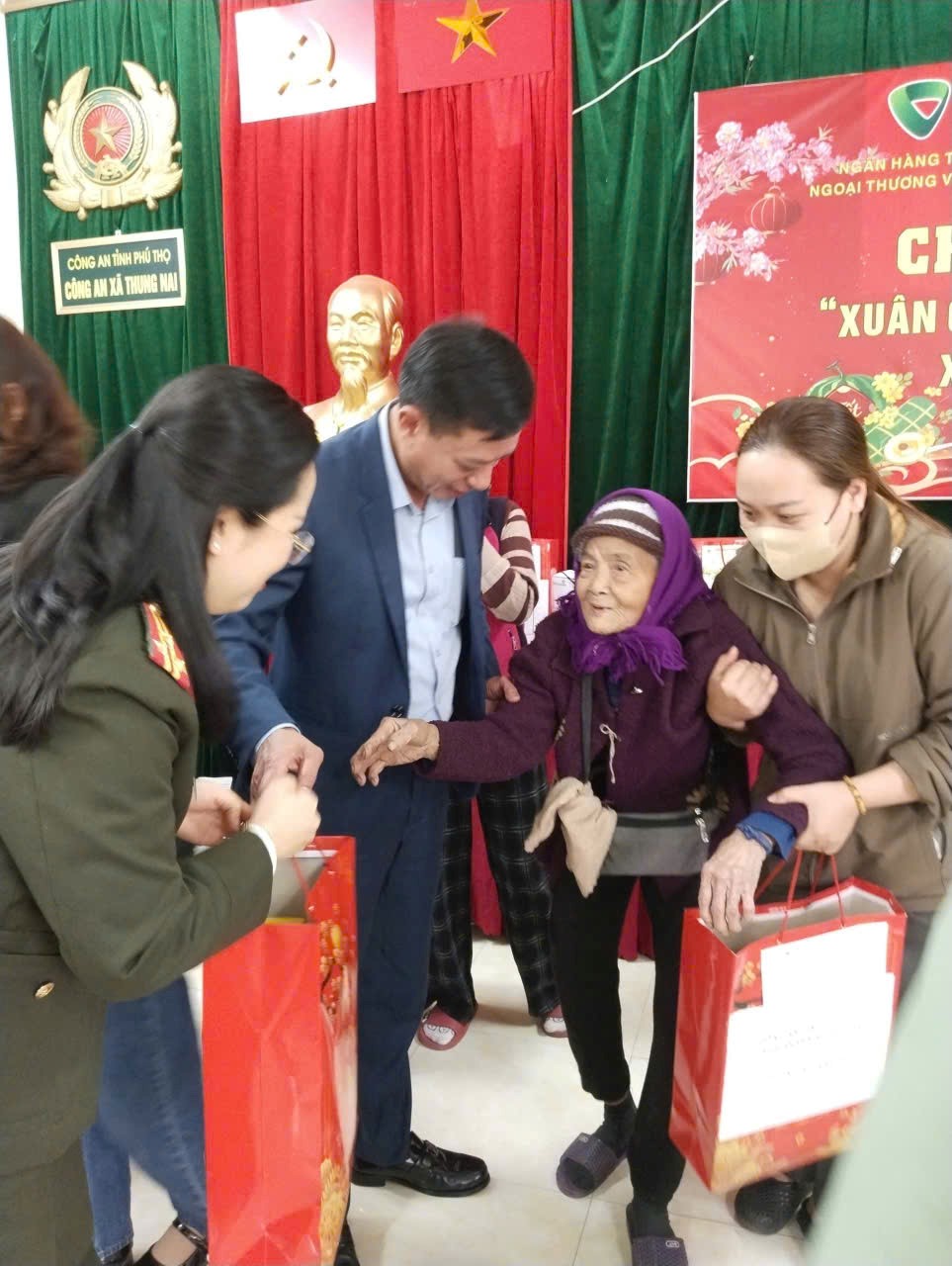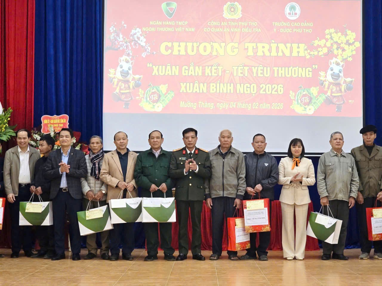 Nhân dịp Tết Nguyên đán Bính Ngọ năm 2026, ngày 04/02/2026, Cơ quan An ninh điều tra Công an tỉnh Phú Thọ phối hợp với Ngân hàng TMCP Ngoại thương Việt Nam – Chi nhánh Phú Thọ và Trường Cao đẳng Y - Dược Phú Thọ tổ chức chương trình “Xuân Gắn Kết - Tết Yêu Thương”, trao quà cho các gia đình chính sách, hộ nghèo và trẻ em có hoàn cảnh khó khăn trên địa bàn xã Mường Thàng và xã Thung Nai, tỉnh Phú Thọ.