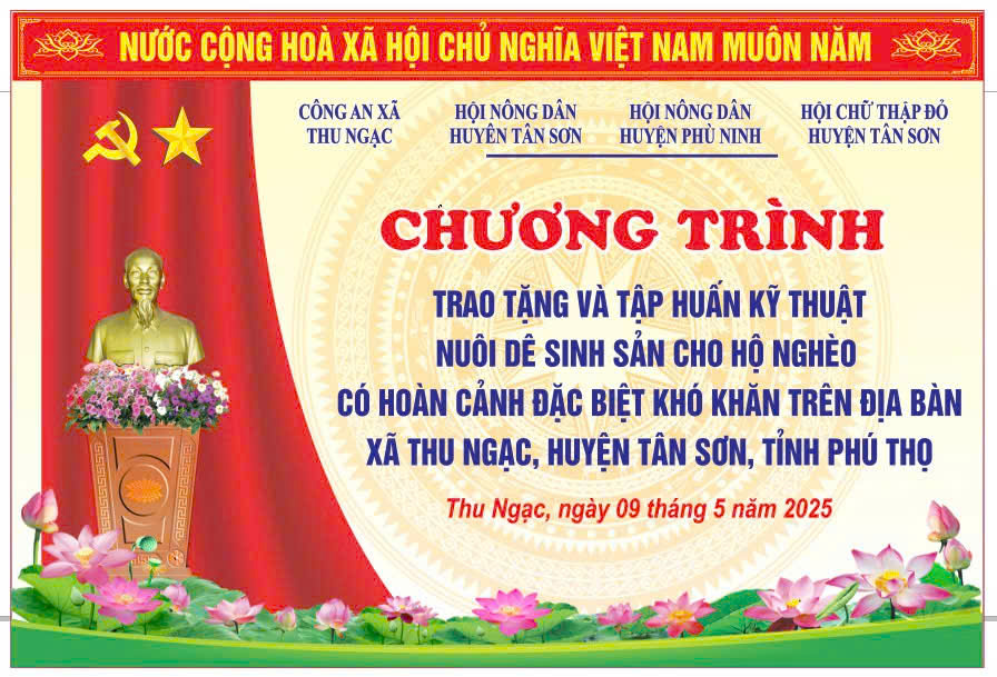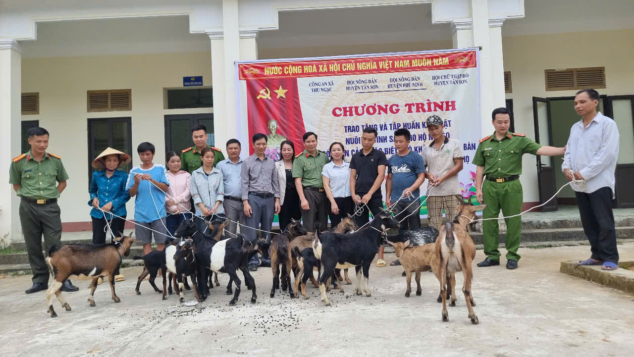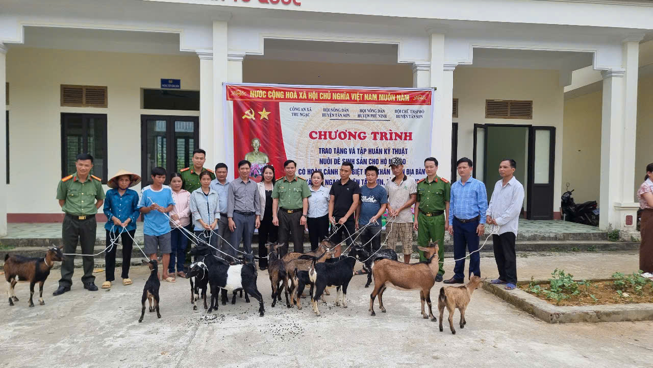 Nhằm góp phần thực hiện hiệu quả chương trình phát triển kinh tế - xã hội, xóa đói giảm nghèo trên địa bàn, ngày 9/5/2025, Công an xã Thu Ngạc, huyện Tân Sơn đã phối hợp với Hội Nông dân huyện Tân Sơn, Hội Nông dân huyện Phù Ninh và Hội Chữ thập đỏ huyện Tân Sơn tổ chức trao tặng 16 con dê giống sinh sản cho 8 hộ nghèo có hoàn cảnh đặc biệt khó khăn trên địa bàn xã.