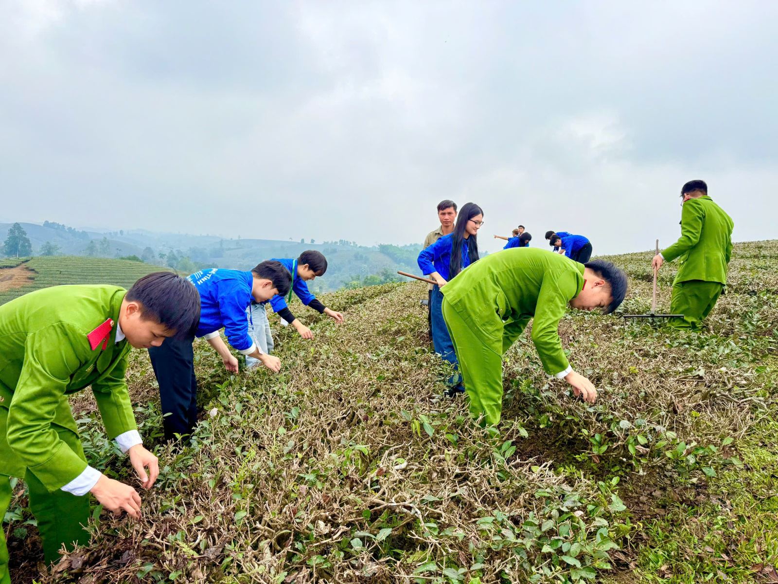 Công an xã phối hợp đoàn thanh niên giúp người dân chăm sóc đồi chè