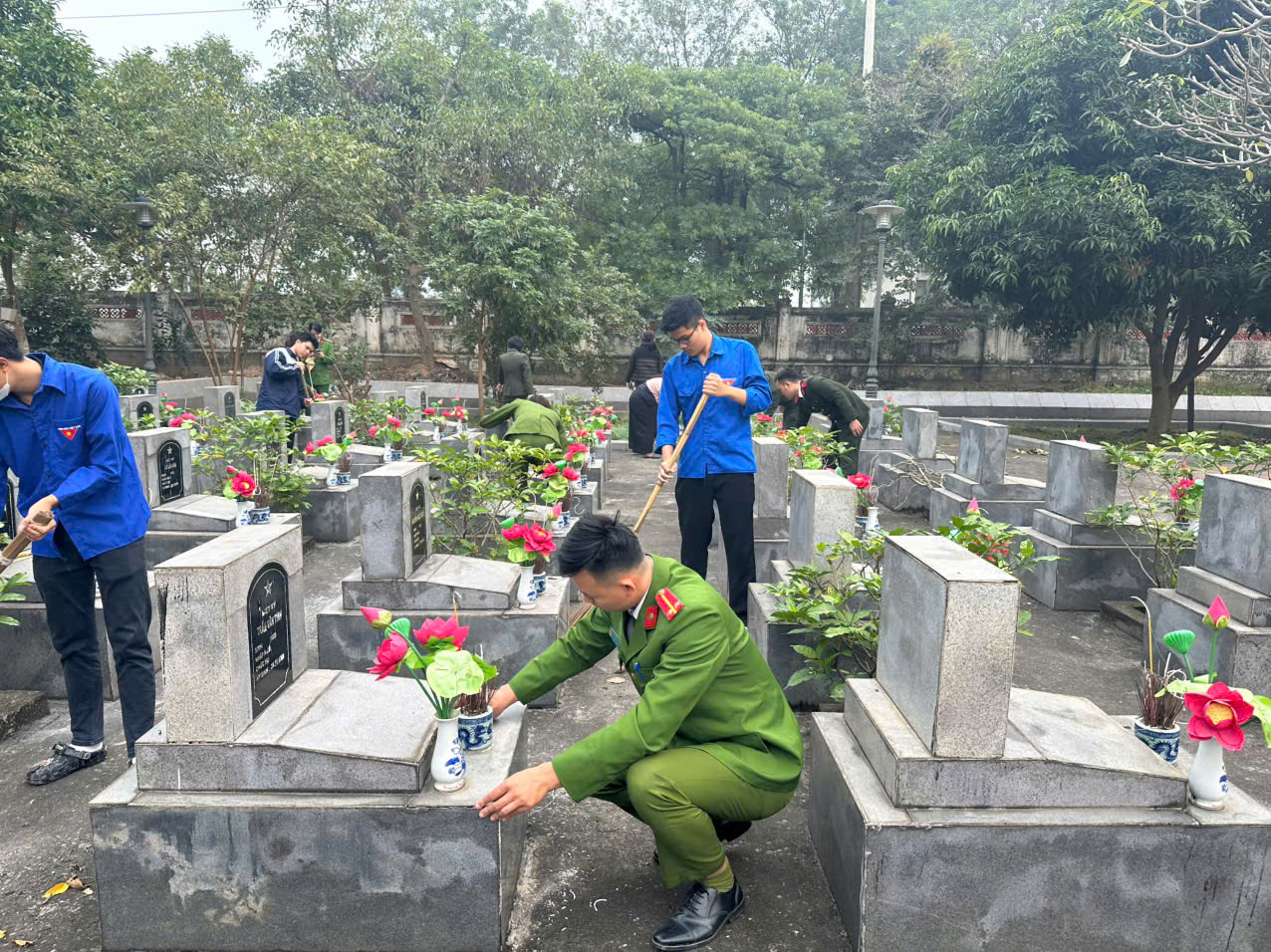 Các cán bộ, chiến sĩ Công an xã đã tiến hành quét dọn, phát quang cây cỏ, lau chùi bia mộ, chỉnh trang khuôn viên Nghĩa trang liệt sĩ