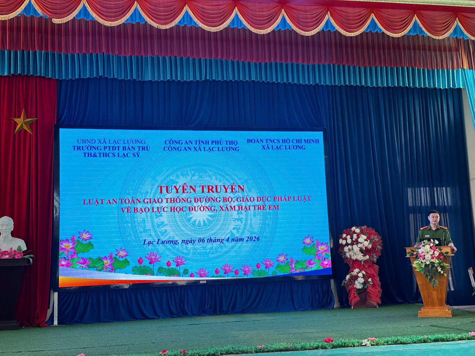 Sáng 06/4/2026, Công an xã Lạc Lương phối hợp với Trường Phổ thông Dân tộc Bán trú Tiểu học và Trung học cơ sở Lạc Sỹ, Đoàn Thanh niên xã tổ chức buổi tuyên truyền pháp luật với sự tham gia của hơn 300 học sinh và giáo viên. Nội dung tập trung vào Luật Trật tự, an toàn giao thông đường bộ, phòng, chống bạo lực học đường và xâm hại trẻ em.