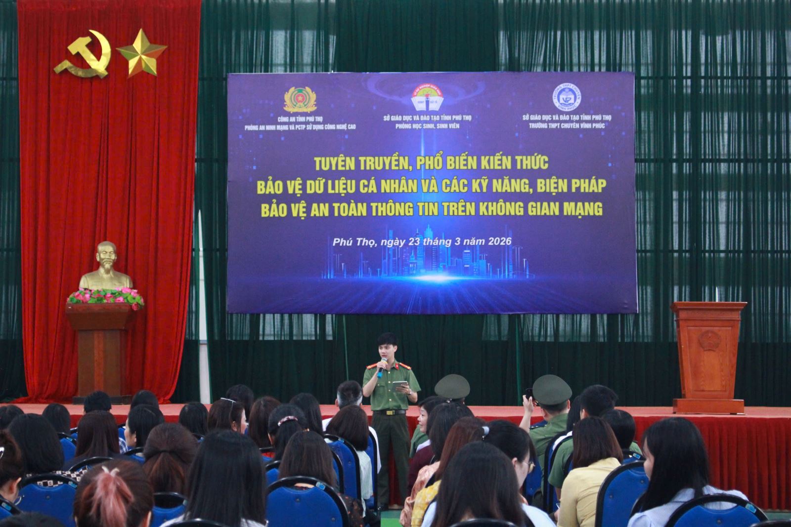 Sáng ngày 23/3/2026, Phòng An ninh mạng và phòng, chống tội phạm sử dụng công nghệ cao - Công an tỉnh Phú Thọ phối hợp với Trường THPT Chuyên Vĩnh Phúc tổ chức buổi tuyên truyền, phổ biến kiến thức về bảo vệ dữ liệu cá nhân và biện pháp, kỹ năng đảm bảo an toàn thông tin trên không gian mạng cho hơn 1.500 học sinh, giáo viên, công nhân viên nhà trường.