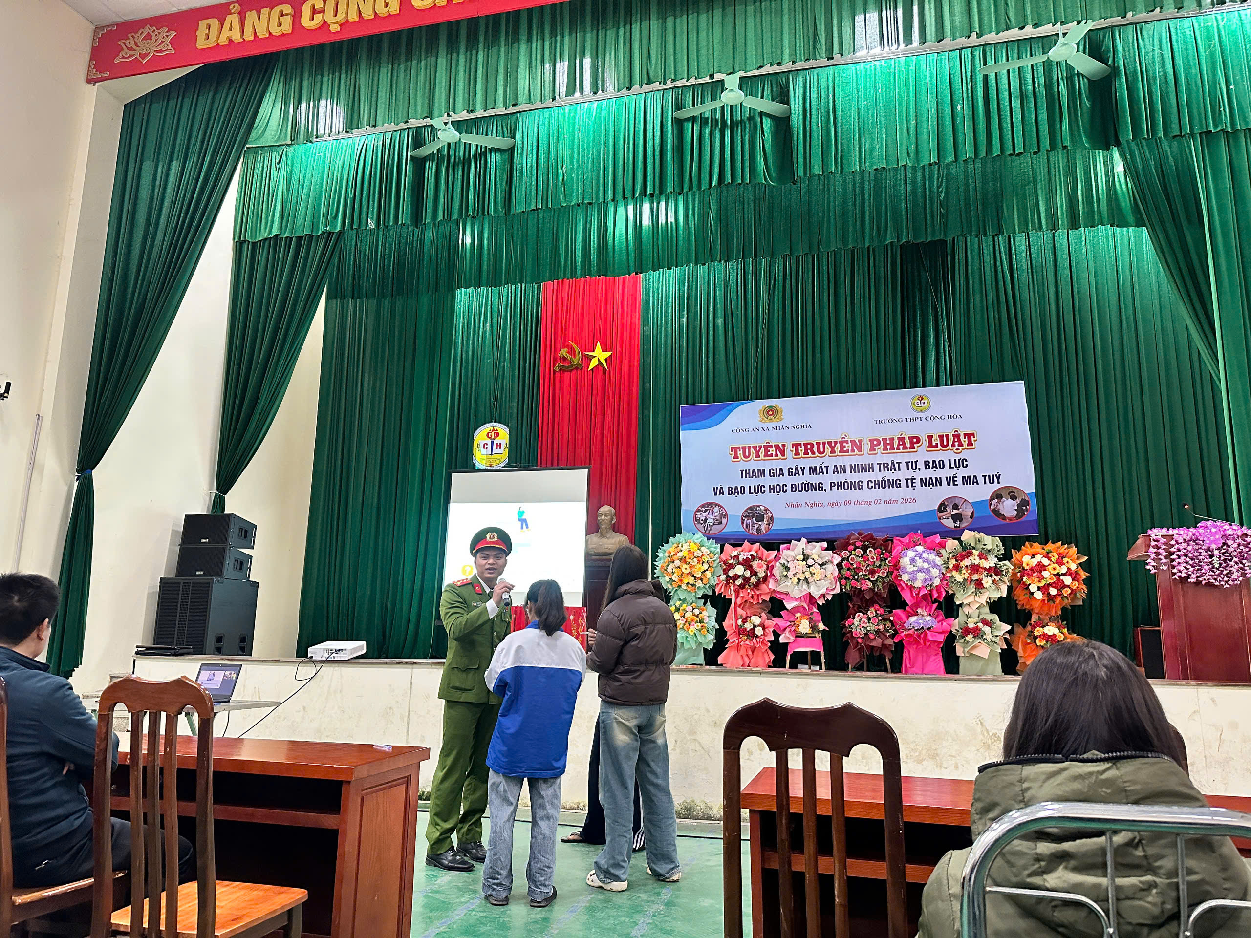Thực hiện kế hoạch công tác tuyên truyền, phổ biến, giáo dục pháp luật trên địa bàn, ngày 09/02/2026, Công an xã Nhân Nghĩa phối hợp với Trường THPT Cộng Hòa tổ chức buổi tuyên truyền pháp luật cho cán bộ, giáo viên và học sinh toàn trường với các nội dung trọng tâm về phòng ngừa hành vi gây mất an ninh trật tự, bạo lực, bạo lực học đường và phòng, chống tệ nạn ma túy.