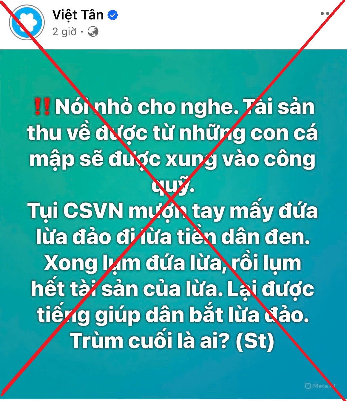 Tổ chức phản động Việt Tân mới đây tiếp tục tung ra bài viết với nội dung sai sự thật, cho rằng Nhà nước Việt Nam “mượn tay lừa đảo để chiếm đoạt tài sản của dân”, “thu lợi từ tài sản tịch thu” và “đóng vai người tốt giúp dân bắt lừa đảo”. Đây là luận điệu xuyên tạc có chủ đích, đầy ác ý, nhằm bôi nhọ Đảng, Nhà nước và lực lượng chức năng, đồng thời kích động tâm lý hoài nghi, bất mãn trong nhân dân.
