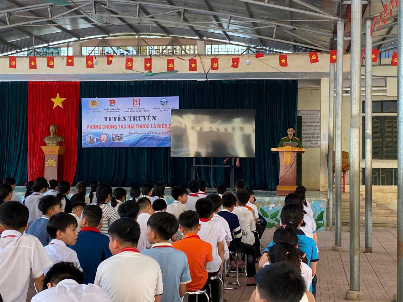 Nhằm nâng cao nhận thức cho học sinh về tác hại của thuốc lá điện tử và góp phần xây dựng môi trường học đường an toàn, lành mạnh, Công an xã Tiền Phong đã phối hợp với Trường Phổ thông dân tộc bán trú Tiểu học và Trung học cơ sở Vầy Nưa tổ chức buổi tuyên truyền phòng, chống thuốc lá điện tử. Sự kiện này có sự tham gia của 165 học sinh và 15 cán bộ, giáo viên nhà trường.