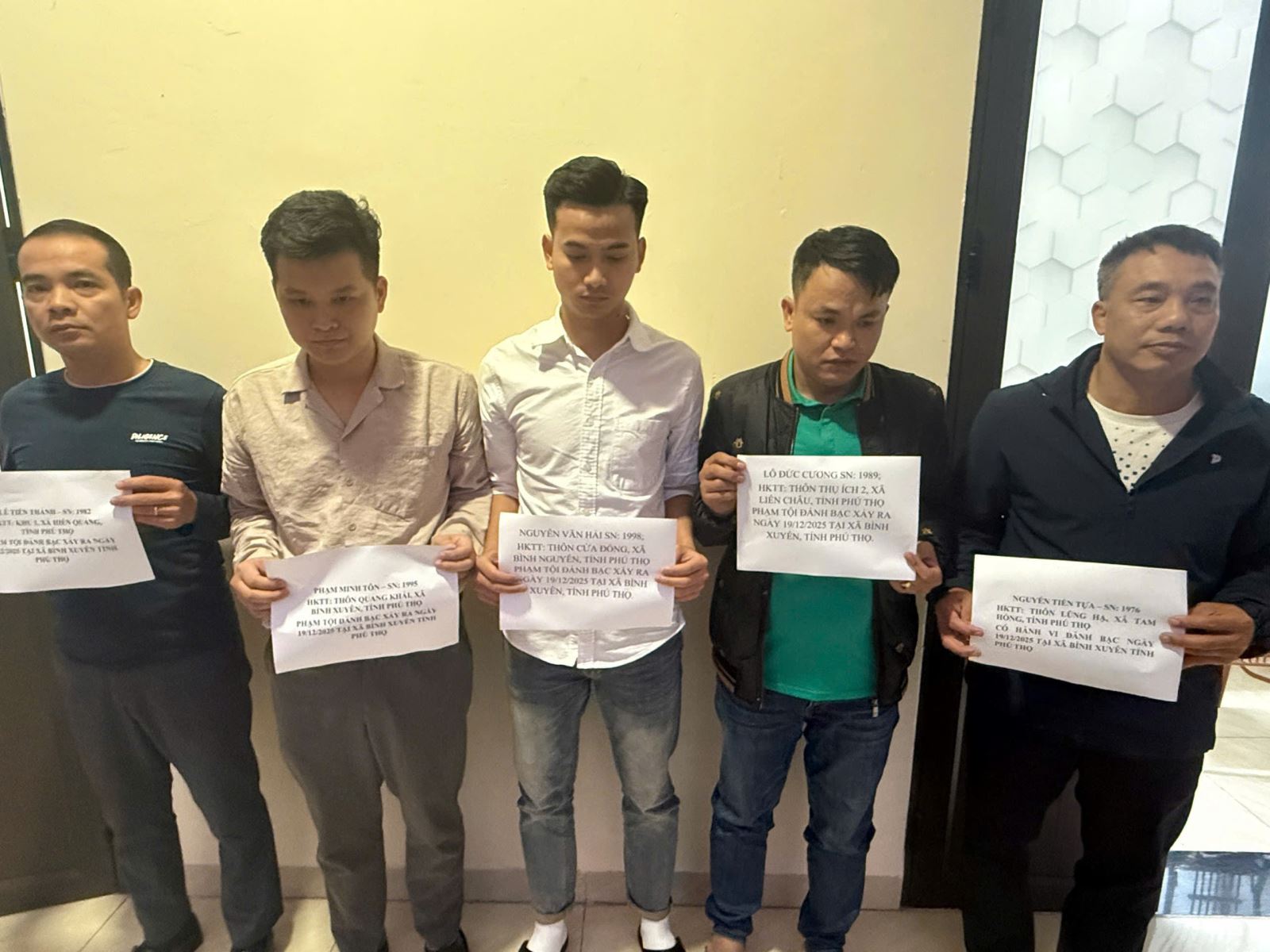 Danh tính các đối tượng gồm: Phạm Minh Tôn, sinh năm 1995, trú tại xã Bình Xuyên, tỉnh Phú Thọ; Lê Tiến Thành, sinh năm 1982, trú tại xã Hiền Quan, tỉnh Phú Thọ; Lỗ Đức Cương, sinh năm 1989, trú tại xã Liên Châu, tỉnh Phú Thọ; Nguyễn Văn Hải, trú tại xã Bình Nguyên, tỉnh Phú Thọ; và Nguyễn Tiến Tựa, sinh năm 1976, trú tại xã Tam Hồng, tỉnh Phú Thọ.
