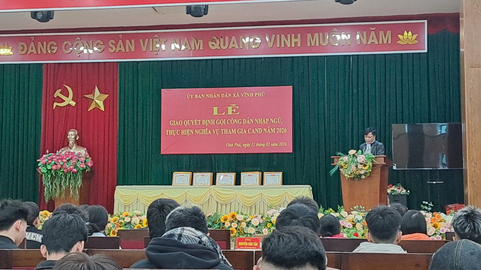 Chiều 12/02/2026, UBND xã Vĩnh Phú tổ chức Lễ giao Quyết định gọi công dân nhập ngũ và thực hiện nghĩa vụ tham gia Công an nhân dân năm 2026. Buổi lễ được tổ chức trang trọng, đúng quy định, bảo đảm yêu cầu đề ra, thể hiện sự chủ động, nghiêm túc của địa phương trong công tác tuyển chọn, gọi công dân nhập ngũ.