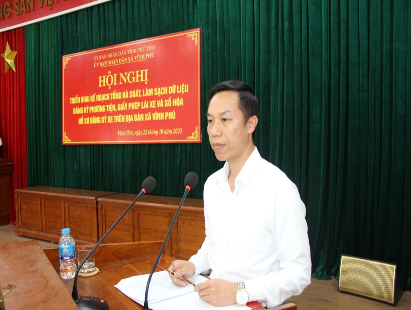 Thực hiện kế hoạch của Công an tỉnh Phú Thọ về việc tổng rà soát, làm sạch dữ liệu đăng ký phương tiện, giấy phép lái xe và số hóa hồ sơ đăng ký xe trên địa bàn toàn tỉnh, ngày 22/10/2025, Ủy ban nhân dân xã Vĩnh Phú phối hợp với Công an xã Vĩnh Phú tổ chức Hội nghị triển khai kế hoạch thực hiện tại địa bàn.