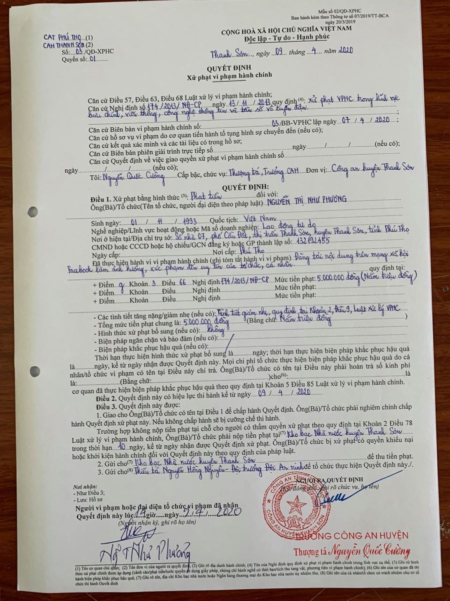 Vừa qua, ngày 9/4/2020, Công an huyện Thanh Sơn đã ra quyết định xử phạt vi phạm hành chính đối với Nguyễn Thị Như Phương, sinh năm 1993, tại thị trấn Thanh Sơn, huyện Thanh Sơn số tiền 5.000.000 đồng về hành vi đăng tải nội dung trên mạng xã hội facebook làm ảnh hưởng, xúc phạm đến uy tín của tổ chức, cá nhân, quy định tại Điểm g, Khoản 3, Điều 66, Nghị định 174/2013/NĐ-CP ngày 13/11/2013 của Chính phủ (nay được thay thế bằng Nghị định 15/2020/NĐ-CP, có hiệu lực từ ngày 15/4/2020) quy định xử phạt vi phạm hành chính trong lĩnh vực bưu chính, viễn thông, công nghệ thông tin và tần số vô tuyến điện.