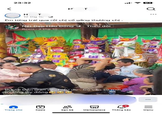 Ngày 12/10/2025, qua công tác trinh sát, nắm tình hình trên không gian mạng, Công an xã Dân Chủ, tỉnh Phú Thọ phát hiện tài khoản Facebook “H.T” chia sẻ một bài viết kèm video từ nhóm “Nét đẹp hầu đồng” với nội dung: “Người trần gian sao hiểu được. Có căn có số mới thương lấy đồng”. Qua xác minh, lực lượng chức năng xác định nội dung bài viết và video mang yếu tố mê tín, dị đoan, có thể tác động tiêu cực đến người xem.