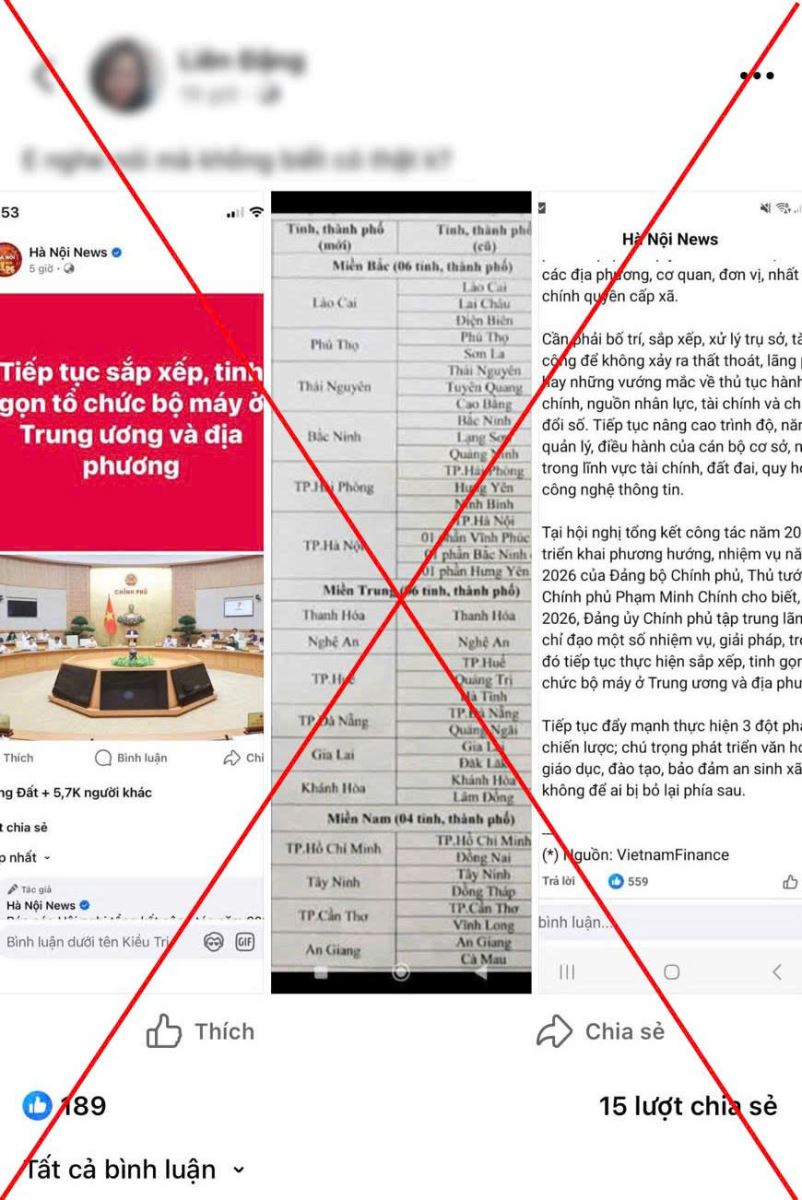 Chị Đ.T.L làm việc với cơ quan Công an Thời gian gần đây trên các nền tảng mạng xã hội như zalo, facbook, tiktok xuất hiện nhiều thông tin về việc sáp nhập một số tỉnh, thành phố. Những thông tin không chính thống được lan truyền mạnh mẽ gây hoang mang dư luận. Tại Họp báo Chính phủ thường kỳ tổ chức ngày 04/3/2026 tại Hà Nội, đại diện Bộ Nội vụ khẳng định Đảng, Quốc hội và Chính phủ không có chủ trương sáp nhập các đơn vị hành chính cấp tỉnh, cấp xã trong thời gian tới. Các thông tin lan truyền trên mạng về việc tiếp tục hợp nhất 34 tỉnh thành xuống còn 16 tỉnh thành là không chính xác.