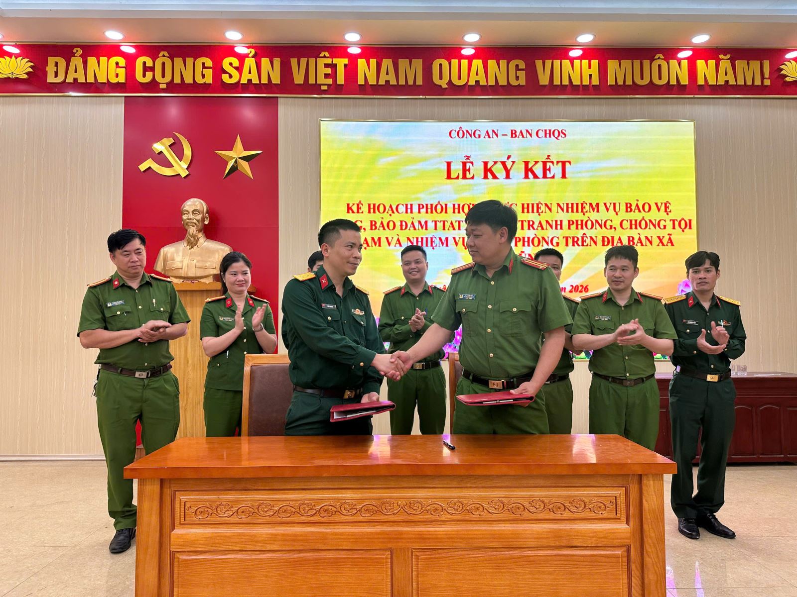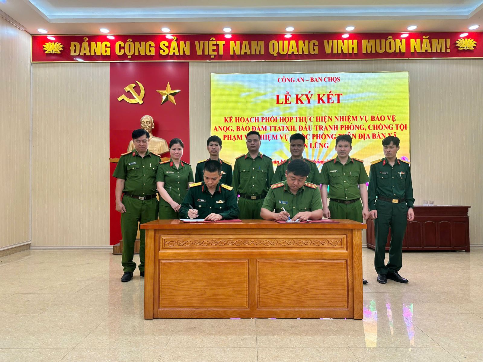 Thực hiện quy định về phối hợp giữa lực lượng Công an và Quân đội trong bảo vệ an ninh quốc gia, ngày 26/3/2026, Công an xã Xuân Lũng phối hợp Ban Chỉ huy Quân sự xã tổ chức hội nghị ký kết phối hợp thực hiện nhiệm vụ bảo đảm an ninh quốc gia, trật tự, an toàn xã hội, đấu tranh phòng, chống tội phạm và nhiệm vụ quốc phòng trên địa bàn.