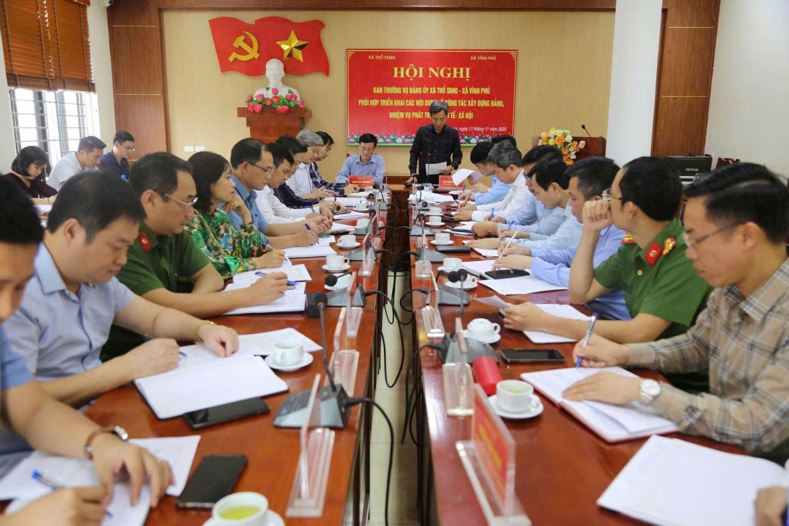 Chiều 11/11/2025, Công an xã Vĩnh Phú tham dự hội nghị phối hợp giữa Đảng ủy, HĐND, UBND, UBMTTQ hai xã Thổ Tang và Vĩnh Phú để trao đổi các nội dung liên quan đến xây dựng Đảng, phát triển kinh tế – xã hội và bảo đảm an ninh trật tự tại khu vực giáp ranh. Hội nghị do đồng chí Đàm Hữu Khanh – Bí thư Đảng ủy, Chủ tịch HĐND xã Thổ Tang và đồng chí Bùi Quang Đạo – Bí thư Đảng ủy, Chủ tịch HĐND xã Vĩnh Phú đồng chủ trì.