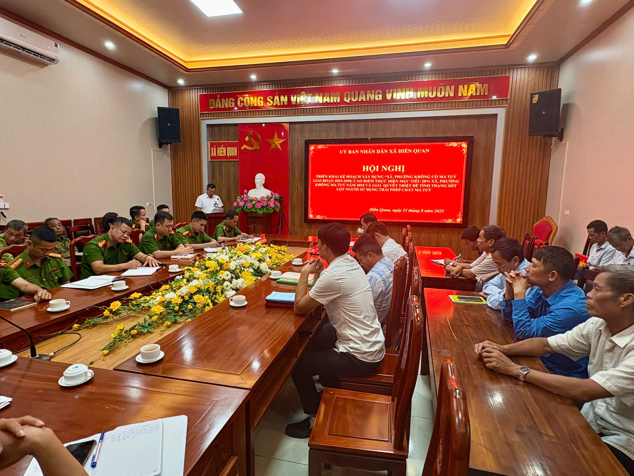 Ngày 25/8/2025, tại Hội trường UBND xã, Công an xã Hiền Quan tổ chức Hội nghị triển khai kế hoạch xây dựng xã Hiền Quan “không ma túy” giai đoạn 2025 - 2030. Tham dự Hội nghị có đồng chí Đặng Đức Hải – Phó Bí thư Thường trực Đảng ủy xã; các đồng chí đại diện lãnh đạo UBND xã, lãnh đạo các phòng, ban, ngành, đoàn thể, đơn vị của xã; tập thể lãnh đạo chỉ huy Công an xã, cán bộ chiến sĩ tổ Cảnh sát khu vực (CSKV), tổ Phòng, chống tội phạm (PCTP) cùng Bí thư chi bộ, Trưởng các khu dân cư, lực lượng ANTT ở cơ sở trên địa bàn.